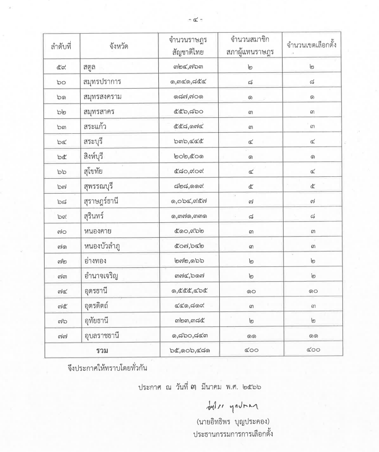 พร้อมกันนี้ได้ลงนามในประกาศคณะกรรมการการเลือกตั้ง เรื่องจำนวนสมาชิกสภาผู้แทนราษฎรแบบแบ่งเขตเลือกตั้ง และเขตเลือกตั้งของแต่ละจังหวัดจะพึงมี โดยจำนวนราษฎรสัญชาติไทย วันที่ 31 ธันวาคม 2565 มีจำนวน 65,106,481 คน จำนวนราษฎรโดยเฉลี่ย 162,766 คน ต่อ ส.ส. 1 คน โดย ส.ส. 77 จังหวัด เมื่อคำนวณจากจำนวนราษฎรที่ไม่นับรวมผู้ไม่มีสัญชาติไทย กรุงเทพมหานคร ยังคงมี ส.ส.มากที่สุด 33 คน ตามมาด้วยนครราชสีมา มี ส.ส.16 คน ส่วน ส.ส. 11 คน มี 2 จังหวัด คือขอนแก่น และอุบลราชธานี