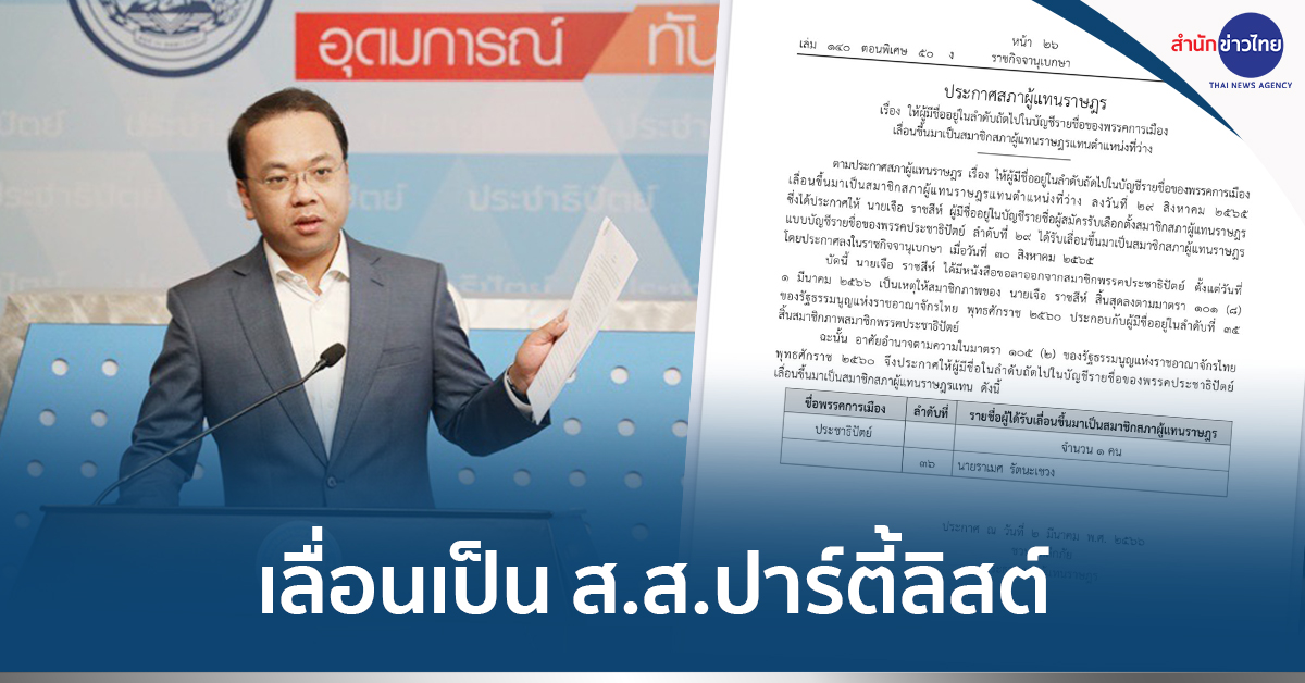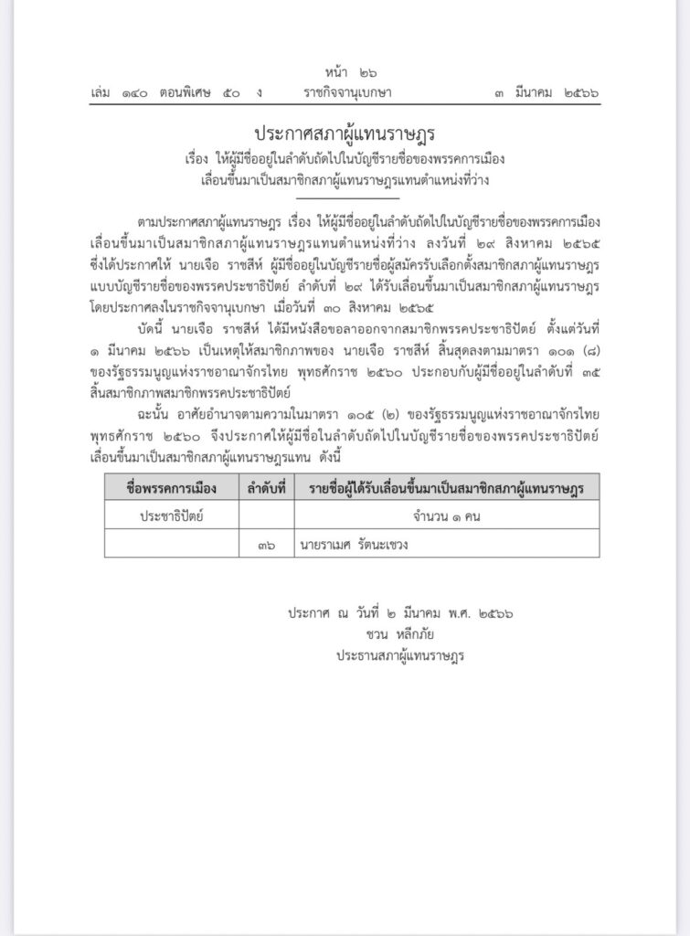 กทม. 4 มี.ค.- ราชกิจจาฯ ประกาศเลื่อน “ราเมศ รัตนะเชวง” เป็น ส.ส.บัญชีรายชื่อ ก่อนครบวาระ 23 มีนาคม 2566 แทน “เจือ ราชสีห์” ที่ลาออกจากพรรคประชาธิปัตย์