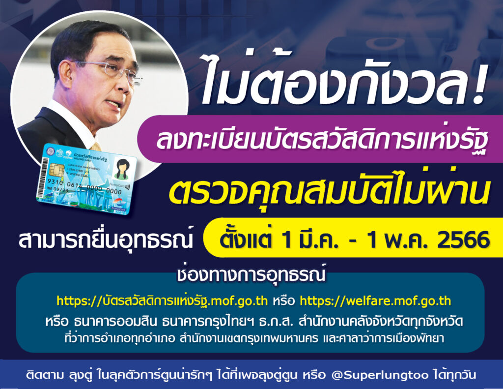 กทม. 4 มี.ค.- เพจ “ลุงตู่ตูน” โพสต์ย้ำไม่ต้องกังวล บัตรสวัสดิการแห่งรัฐไม่ผ่าน ต้อง “ยื่นอุทธรณ์” ภายใน 1 พ.ค. 66