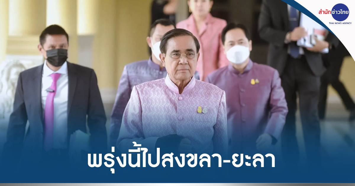 ช่วงเช้า เวลาประมาณ 09.00 น. นายกรัฐมนตรีพร้อมคณะ เดินทางโดยเครื่องบินของกองทัพอากาศ จากท่าอากาศยานทหาร 2 กองบิน 6 (บน.6) ดอนเมือง กรุงเทพฯ ไปยังท่าอากาศยานทหารกองบิน 56 อำเภอคลองหอยโข่ง จังหวัดสงขลา จากนั้น นายกรัฐมนตรีจะไปสักการะศาลเจ้าพ่อหลักเมืองสงขลา ตำบลบ่อยาง อำเภอเมืองสงขลา เพื่อความเป็นสิริมงคล ก่อนที่นายกรัฐมนตรีจะเดินทางไปยังแพขนานยนต์ ตำบลบ่อยาง อำเภอเมืองสงขลา เพื่อตรวจเยี่ยมพื้นที่ก่อสร้างสะพานข้ามทะเลสาบสงขลาเพื่อเชื่อมอำเภอเมืองสงขลากับอำเภอสิงหนคร และรับฟังรายงานสรุปข้อมูลการยกระดับโรงพยาบาลอำเภอเมืองสงขลา พร้อมกล่าวมอบนโยบายและพบปะประชาชน ต่อจากนั้น เวลาประมาณ 12.40 น. นายกรัฐมนตรีจะพบปะพี่น้องประชาชนชาวหาดใหญ่ ณ ตลาดสันติสุขและตลาดกิมหยง อำเภอหาดใหญ่ แล้วออกเดินทางไปจังหวัดยะลา