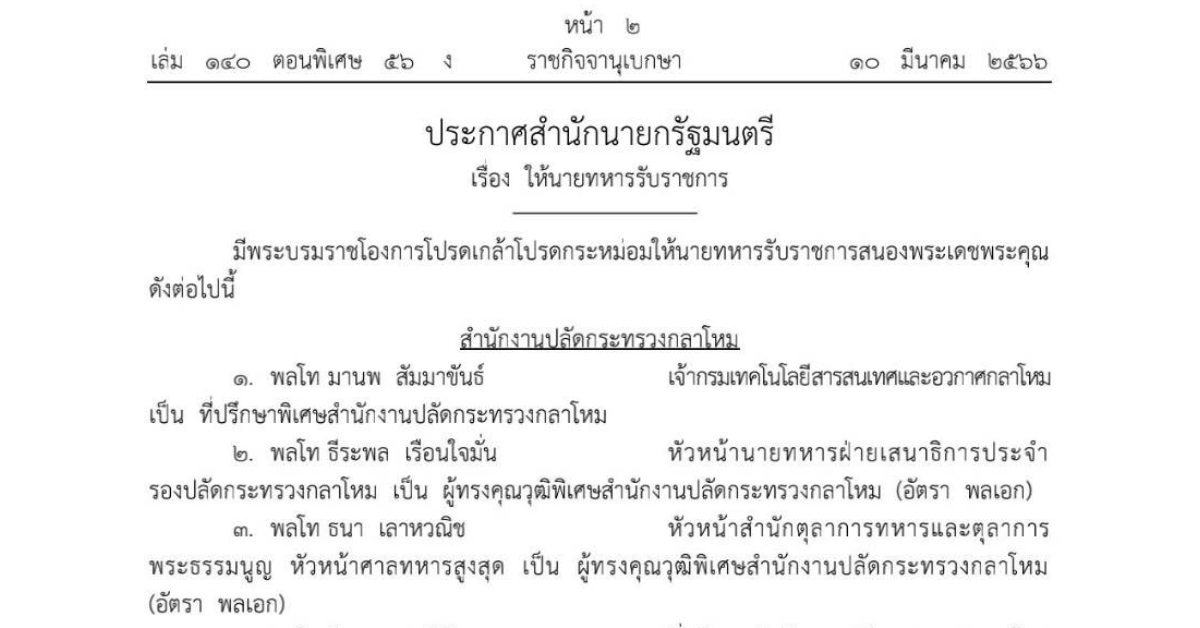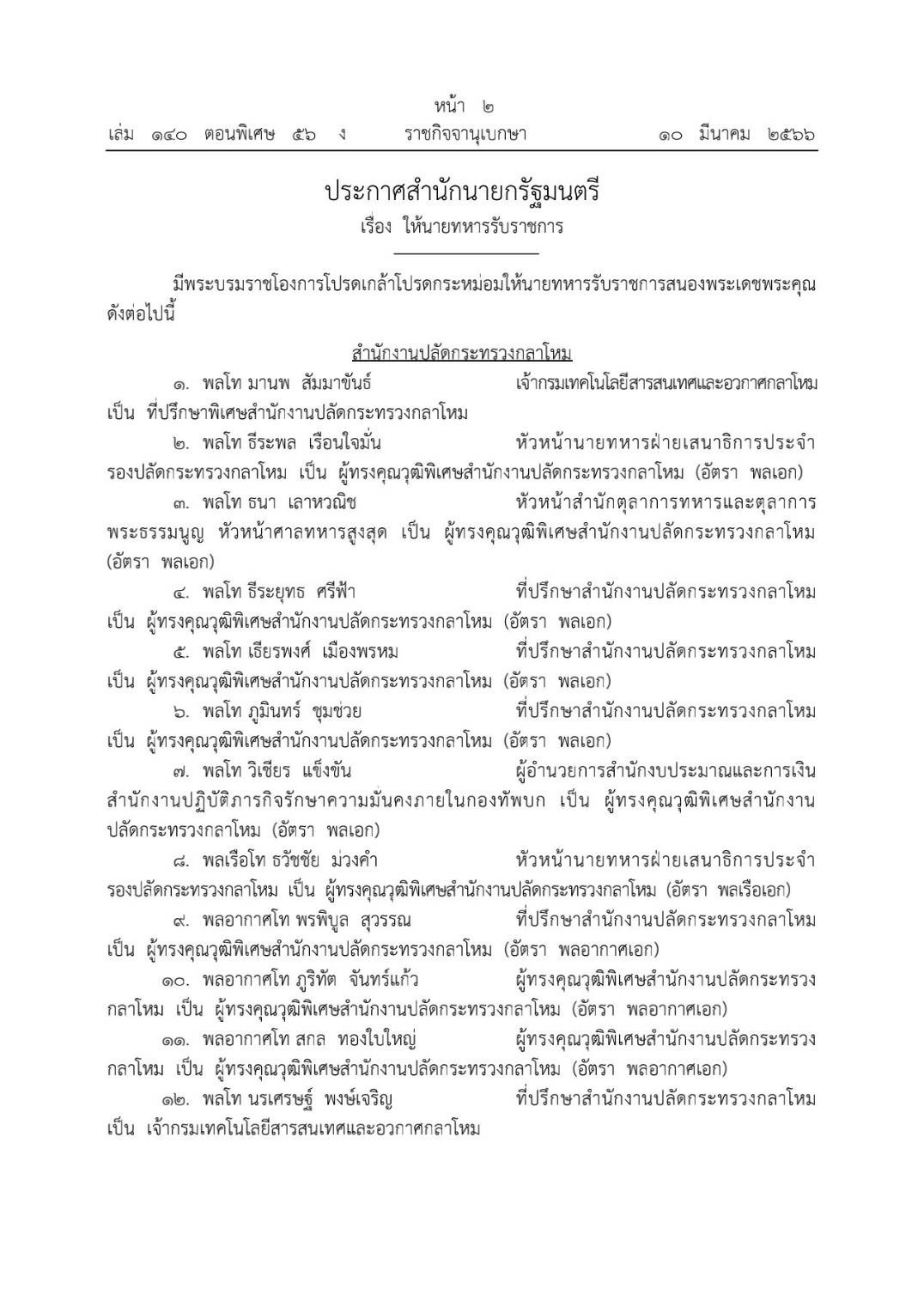 10 มี.ค. – มีพระบรมราชโองการโปรดเกล้าฯ แต่งตั้งนายทหารกลางปี ประจำเดือนเมษายน 2566 จำนวนทั้งสิ้น 249 นาย