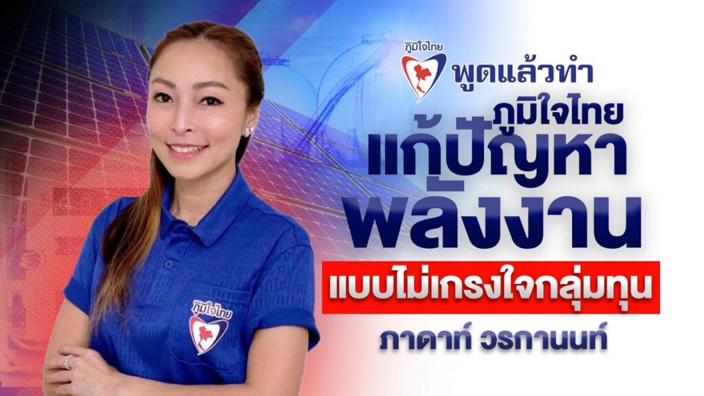น.ส.ภาดาท์ วรกานนท์ หรือ “ส.ส.วัน” ว่าที่ผู้สมัคร ส.ส.กทม. เขตราชเทวี-พญาไท พรรคภูมิใจไทย กล่าวผ่านรายการ “พรรคภูมิใจไทย พูดแล้วทำ” เผยแพร่ทางเฟซบุ๊ก ยูทูบ และ TikTok พรรคภูมิใจไทย ถึงปัญหาค่าพลังงานแพง ที่ส่งผลกระทบทั้งประชาชนและภาคธุรกิจเอกชน ว่า วันนี้คนไทยทุกคนเดือดร้อนกับค่าพลังงานที่สูงขึ้น ทั้งค่าไฟฟ้า ก๊าซ หรือน้ำมัน ซึ่งเป็นเพราะอะไร โครงสร้างราคา และการบริหารจัดการพลังงานของภาครัฐ ตั้งแต่โครงสร้างน้ำมันที่วันนี้อิงราคาน้ำมันของตลาดสิงคโปร์ ซึ่งก็มีคำถามมาตลอดว่า เหตุใดกระทรวงพลังงานถึงกำหนดราคาน้ำมันสำเร็จรูปหน้าโรงกลั่น เป็นราคาที่ประหนึ่งว่า เรานำเข้ามาจากต่างประเทศ ทั้งที่ไทยเราสามารถผลิตกลั่นน้ำมันเองได้เกือบทั้งหมดที่เราใช้อยู่ จึงไม่มีเหตุผลที่ต้องไปอิงราคาตลาดต่างประเทศ และบวกค่าขนส่ง ค่าสูญเสียระหว่างทาง