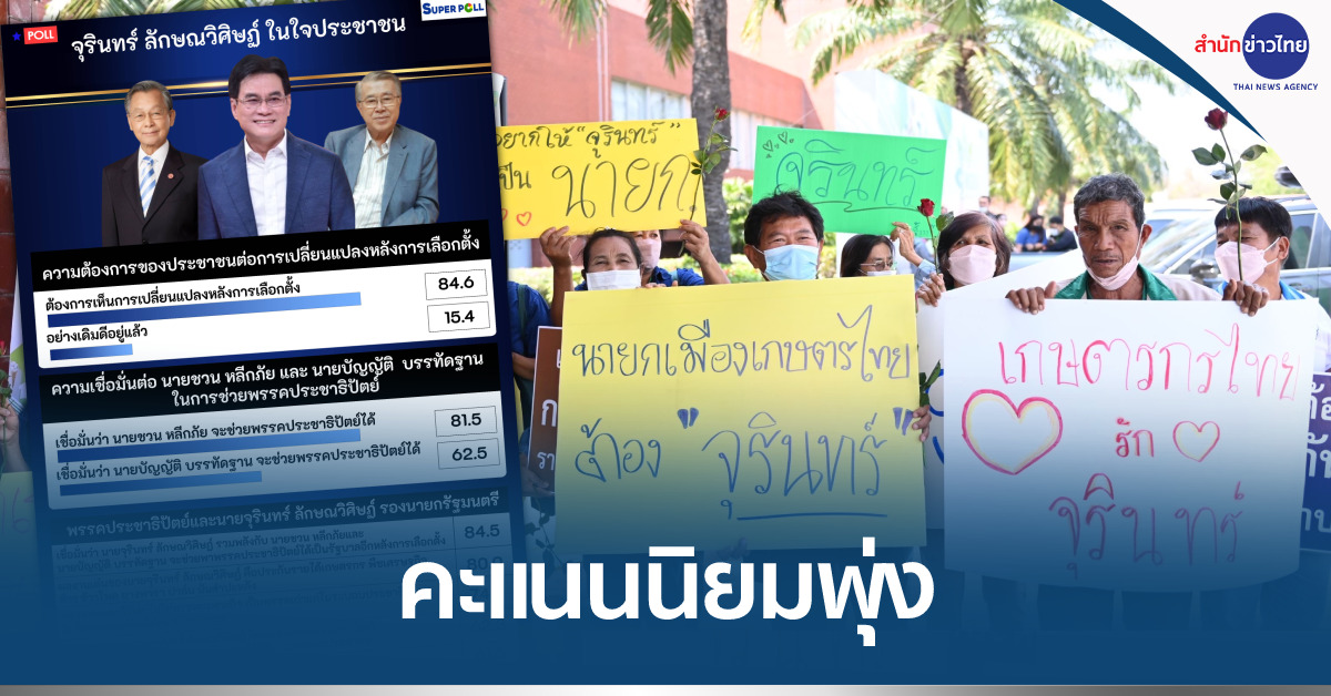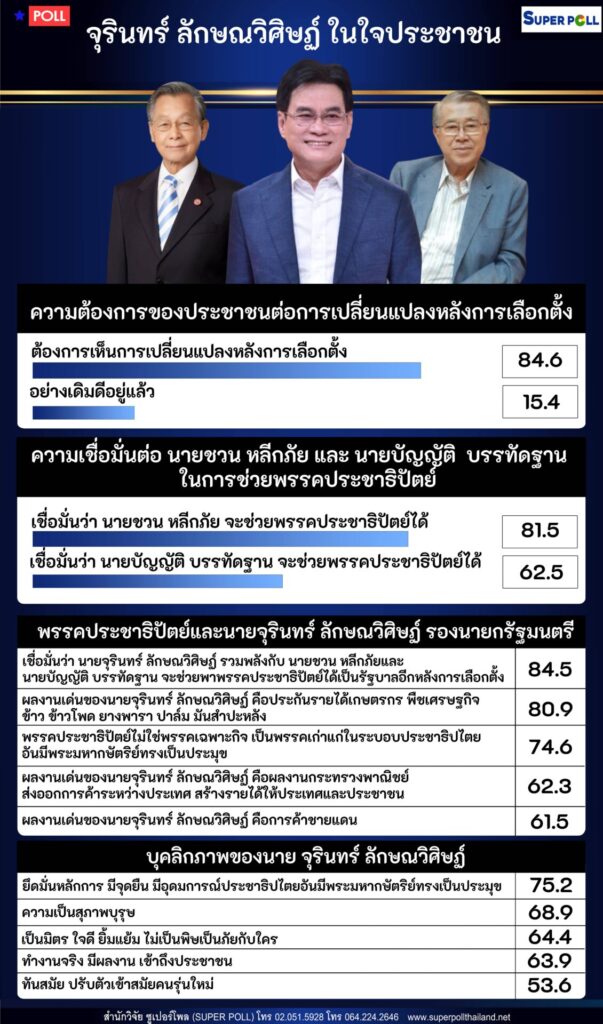 12 มีนาคม 2566 ผู้สื่อข่าวรายงานว่า สำนักวิจัยซูเปอร์โพล (SUPER POLL) เปิดผลสํารวจ เรื่อง จุรินทร์ ลักษณวิศิษฏ์ ในใจประชาชน กรณีศึกษาตัวอย่างประชาชนทุกสาขาอาชีพทั่วประเทศ ดําเนินโครงการทั้งการวิจัยเชิงปริมาณ (Quantitative Research) และการวิจัยเชิงคุณภาพ (Qualitative Research) จํานวน 1,102 ตัวอย่าง ระหว่างวันที่ 5 – 10 มีนาคม พ.ศ.2566 โดยมีค่าความคลาดเคลื่อนจากขนาดตัวอย่างบวกลบร้อยละ 5 ในช่วงความเชื่อมั่นร้อยละ 95 พบว่า ส่วนใหญ่หรือร้อยละ 84.6 ต้องการเห็นการเปลี่ยนแปลงหลังการเลือกตั้ง ในขณะที่ร้อยละ 15.4 ระบุอย่าง เดิมดีอยู่แล้ว