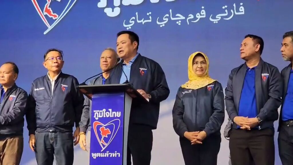 เมื่อเวลา 16.00 น. วันที่ 12 มี.ค. ผู้สื่อข่าวรายงานว่า ที่สวนสาธารณะเฉลิมพระเกียรติ 6 รอบ (สวน ร.5) ต.บางนาค อ.เมือง จ.นราธิวาส พรรคภูมิใจไทย (ภท.) นำโดย นายอนุทิน ชาญวีรกูล รองนายกรัฐมนตรี และรมว.สาธารณสุข ในฐานะหัวหน้าพรรคภูมิใจไทย และคณะ อาทิ นายพิพัฒน์ รัชกิจประการ รมว.ท่องเที่ยวและกีฬา ในฐานะรองหัวหน้าพรรค นายทรงศักดิ์ ทองศรี รมช.มหาดไทย ในฐานะรองหัวหน้าพรรค น.ส.มนัญญา ไทยเศรษฐ์ รมช.เกษตรและสหกรณ์ นายศุภชัย ใจสมุทร ส.ส.บัญชีรายชื่อ และนายทะเบียนพรรค นายนัดมุดดีน อูมา ว่าที่ผู้สมัคร ส.ส.บัญชีรายชื่อ และนายสิรภพ ดวงสอดศรี ผอ.พรรค ในฐานะรับผิดชอบพื้นที่ 3 จังหวัดชายแดนใต้ จัดเวทีปราศรัยพร้อมเปิดตัวว่าที่ผู้สมัครส.ส. ของพรรคภูมิใจไทยพื้นที่ 3 จังหวัดชายแดนใต้ ประกอบด้วย จ.ปัตตานี ได้แก่ น.ส.เพชรดาว โต๊ะมีนา เขต 1 นายอับดุลบาซิม อาบู เขต 2 นายอับดุลกอฮาร์ อาแวปูเตะ เขต 3 และนายฟรีดี เบญอิบรอน เขต 4 จ.นราธิวาส ได้แก่ นายลุตฟี หะยีอีแต เขต 1 นายราชวัตร เด่นตุลาการ เขต 2 นท.สุกรี ศรีริกานนท์ เขต 3 นายซาการียา สะอิ เขต 4 และนายสุกรี มะเต๊ะ เขต 5 จ.ยะลา ได้แก่ นายเกษมสันต์ สาแม เขต 1 นายอับดุลฮาฟิซ เขต 2 และนายมะรูดีน กาโฮง เขต 3 โดยบรรยากาศเป็นไปด้วยความคึกคักท่ามกลางประชาชนกว่า 1.5 หมื่นคน มาร่วมรับฟังการปราศรัยในครั้งนี้