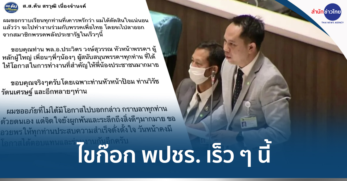 กรุงเทพฯ 14 มี.ค.- “สรวุฒิ” โพสต์เฟซบุ๊กเตรียมไขก๊อกพปชร. เร็ว ๆ นี้ ไปอยู่พรรคเพื่อไทย ขอบคุณ “พล.อ.ประวิตร” ที่ให้โอกาสทำงานให้ประชาชน