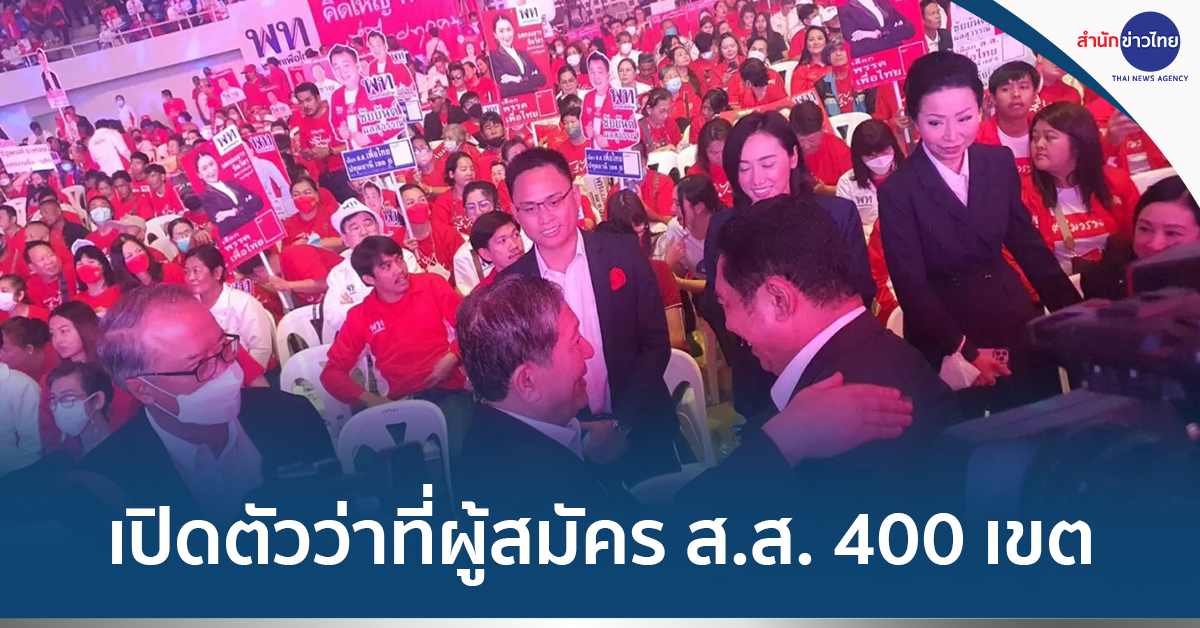 ผู้สื่อข่าวรายงานว่า พรรคเพื่อไทยจัดงาน ‘คิดใหญ่ ทำเป็น เพื่อไทยทุกคน” เปิดตัวผู้ประสงค์ลงสมัครสมาชิกสภาผู้แทนราษฎร 400 คน โดย นพ. ชลน่าน ศรีแก้ว ส.ส.น่าน และหัวหน้าพรรคเพื่อไทย บรรยากาศเป็นไปอย่างคึกคัก มีนางสาวแพทองธาร ชินวัตร หัวหน้าครอบครัวเพื่อไทย และประธานที่ปรึกษาด้านการมีส่วนร่วมและนวัตกรรม พรรคเพื่อไทย