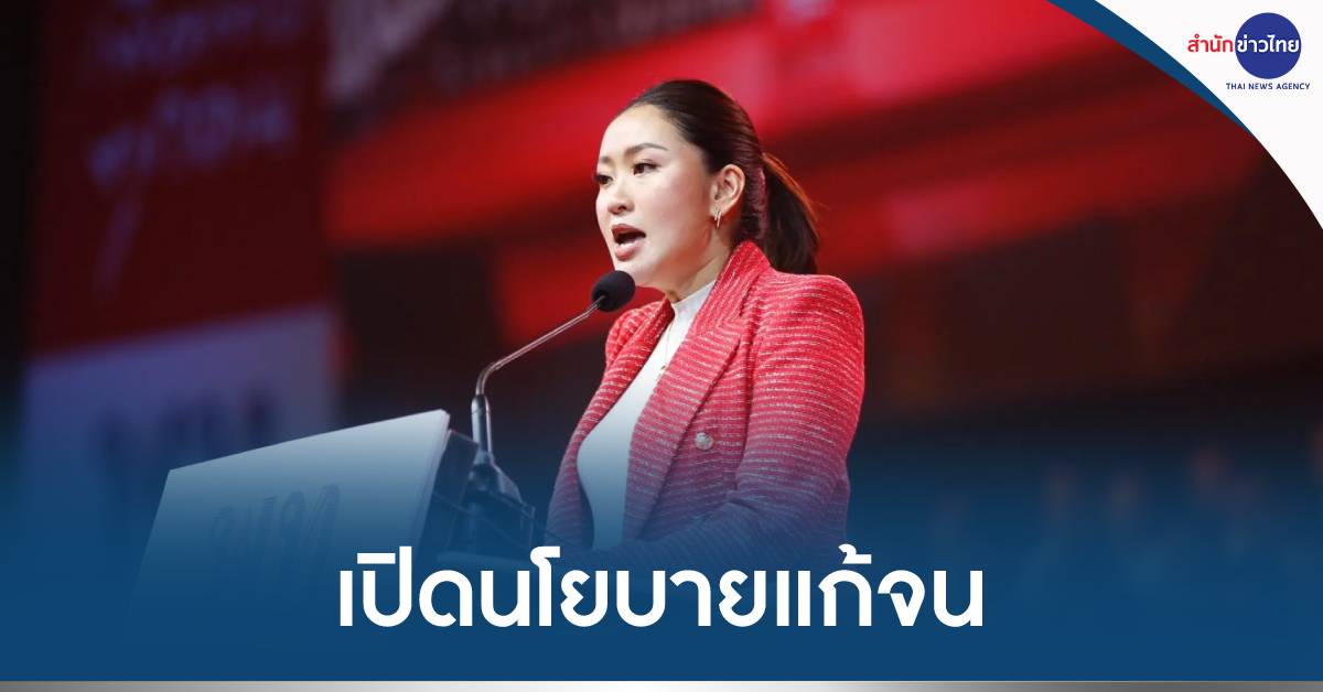 “ปัญหาเหล่านี้ ถ้าพรรคเพื่อไทยไม่คิดใหญ่ก็เอาไม่อยู่ พรรคเพื่อไทยจึงคิดใหญ่ ทำเป็นพร้อมประกาศ 3 นโยบายที่จะพัฒนาคุณภาพชีวิตคนไทยให้อยู่ได้อย่างมีศักดิ์ศรี คือ นโยบายแรก แก้จน ลดช่องว่างของรายได้ แม้รัฐจะจ่ายเงินคนจนและเงินชดเชยแต่ก็ยังไม่เพียงพอ พรรคเพื่อไทยยอมไม่ได้ที่จะให้คนไทยอยู่อย่างไม่มีเกียรติ ไม่มีศักดิ์ศรีและแร้นแค้น นอกจากนโยบาย ค่าแรงขั้นต่ำ 600 บาทต่อวันเงินเดือนจบปริญญาตรี 25,000 บาทต่อเดือน สร้างงานสร้างอาชีพ 20 ล้านตำแหน่งแล้ว” น.ส.แพรทองธาร กล่าว