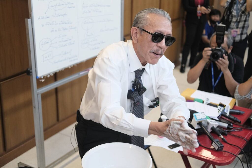 นอกจากนั้นนายชูวิทย์ยังได้ล้างมือโชว์ เพื่อตอบโต้กรณีพรรคภูมิใจไทยบอกว่าตนเองมือสกปรกรับงานมาจากบุคคลอื่นเพื่อทำลายชื่อเสียงของพรรค