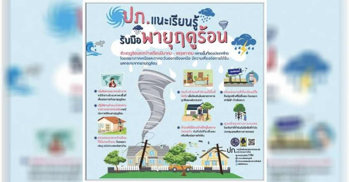 ช่วงฤดูร้อนหลายพื้นที่มักได้รับผลกระทบจากพายุฤดูร้อน สร้างความเสียหายแก่ทรัพย์สิน และก่อให้เกิดอันตรายต่อชีวิต เพื่อความปลอดภัย กระทรวงมหาดไทย โดยกรมป้องกันและบรรเทาสาธารณภัย (ปภ.) ขอแนะการเตรียมพร้อมรับมือ และปฏิบัติตนอย่างปลอดภัยเมื่อเกิดพายุฤดูร้อน ดังนี้