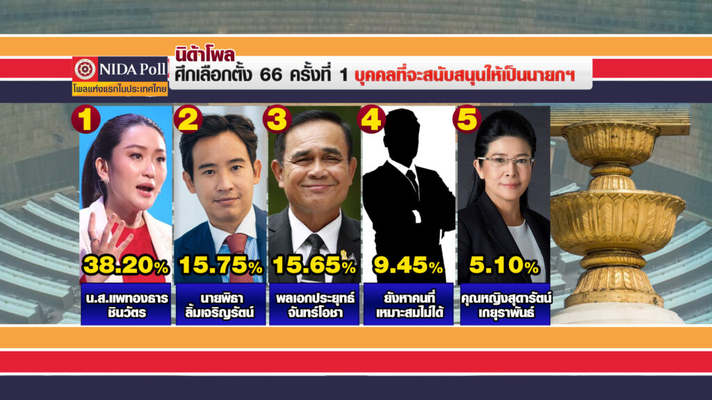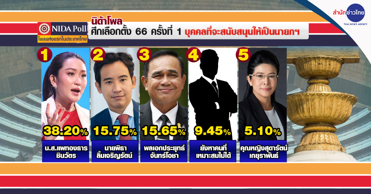 นิด้าโพล ถามถึงบุคคลที่ประชาชนจะสนับสนุนให้เป็นนายกรัฐมนตรีในการเลือกตั้งครั้งนี้ พบว่า อันดับสูงสุด ระบุว่าเป็น น.ส.แพทองธาร ชินวัตร หัวหน้าครอบครัวพรรคเพื่อไทย ด้วยจำนวน 38.20% รองลงมา คือ นายพิธา ลิ้มเจริญรัตน์ หัวหน้าพรรคก้าวไกล ด้วยจำนวน 15.75% , พล.อ.ประยุทธ์ จันทร์โอชา นายกรัฐในตรี และรมว.กลาโหม จากพรรครวมไทยสร้างชาติ ด้วยจำนวน 15.65% ต่อมา คือ คุณหญิงสุดารัตน์ เกยุราพันธุ์ หัวหน้าพรรคไทยสร้างไทย ด้วยจำนวน 5.10%, พล.ต.อ.เสรีพิศุทธ์ เตมียเวส หัวหน้าพรรคเสรีรวมไทย ด้วยจำนวน 4.45%, นายจุรินทร์ ลักษณวิศิษฏ์ รองนายกรัฐมนตรี และรมว.พาณิชย์ ฐานะหัวหน้าพรรคประชาธิปัตย์ ด้วยจำนวน 2.35%