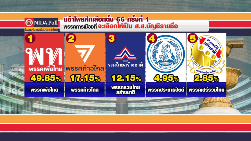 พรรคการเมืองที่ประชาชนจะเลือกให้เป็น ส.ส. แบบบัญชีรายชื่อ พบว่า อันดับสูงสุด ยังเป็นพรรคเพื่อไทย คิดเป็น 49.85% รองลงมา คือ พรรคก้าวไกล คิดเป็น 17.15% , พรรครวมไทยสร้างชาติ 12.15%, พรรคประชาธิปัตย์ คิดเป็น 4.95% ต่อมา คือ พรรคเสรีรวมไทย คิดเป็น 2.85%, พรรคไทยสร้างไทย คิดเป็น 2.60% , พรรคภูมิใจไทย คิดเป็น 2.55%, พรรคพลังประชารัฐ คิดเป็น 2.30% .-สำนักข่าวไทย