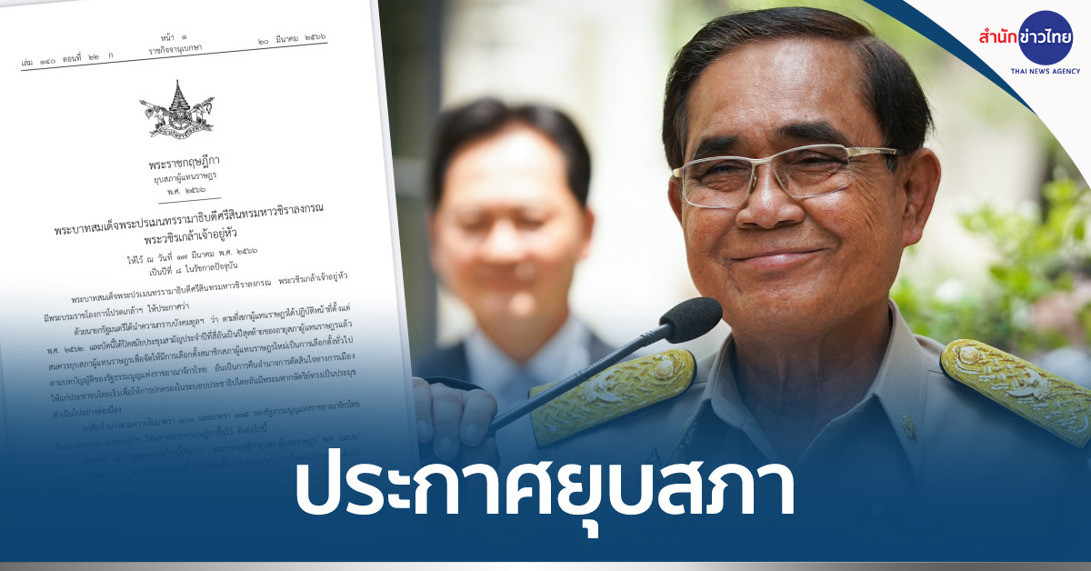 กรุงเทพฯ 20 มี.ค. – ราชกิจจานุเบกษาเผยแพร่ประกาศ พระราชกฤษฎีกายุบสภาผู้แทนราษฎร บังคับตั้งแต่วันนี้ (20 มี.ค.) เป็นต้นไป