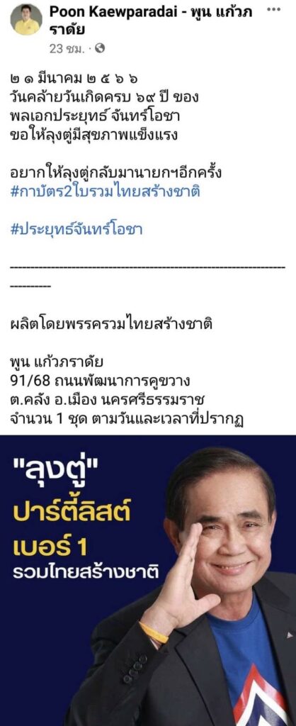 ขณะที่เพจเฟซบุ๊กของนายพูน แก้วภราดัย ว่าที่ผู้สมัคร ส.ส. จ.นครศรีธรรมราช เขต 1 พรรครวมไทยสร้างชาติ ได้โพสข้อความอวยพรวันคล้ายวันเกิด พล.อ.ประยุทธ์ เมื่อวันที่ 21 มีนาคมที่ผ่านมา พร้อมโพสภาพรูป พลเอกประยุทธ์ พร้อมข้อความที่ว่า “ลุงตู่ ปาร์ตี้ลิสต์เบอร์ 1 รวมไทยสร้างชาติ” ทั้งนี้ ภายหลังโพสข้อความดังกล่าว ในเวลาต่อมาเพจเฟซบุ๊กของนายพูน ก็ได้ลบข้อความและรูปภาพดังกล่าวออกไป