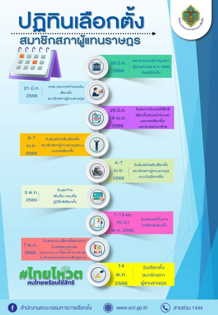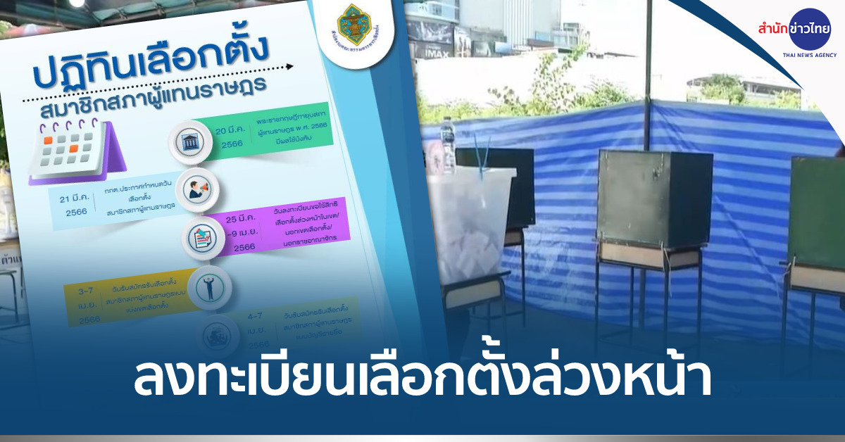 สำนักงาน กกต. แจ้งว่า ตามที่ กกต. ได้กำหนดวันเลือกตั้ง ส.ส. เป็นการทั่วไป ในวันอาทิตย์ที่ 14 พ.ค.66 โดยในระหว่างวันที่ 25 มี.ค–9 เม.ย.66 กกต. กำหนดให้เป็นวันลงทะเบียนขอใช้สิทธิเลือกตั้งล่วงหน้าในเขตเลือกตั้ง นอกเขตเลือกตั้ง และนอกราชอาณาจักร ซึ่งประชาชนผู้มีสิทธิเลือกตั้งที่มีความประสงค์จะลงคะแนนเลือกตั้งล่วงหน้านอกเขตเลือกตั้งที่ตนมีชื่ออยู่ในทะเบียนบ้าน หรือมีชื่ออยู่ในทะเบียนในเขตเลือกตั้งน้อยกว่า 90 วัน นับถึงวันเลือกตั้งและผู้มีสิทธิเลือกตั้ง ซึ่งได้รับคำสั่งจากทางราชการให้ไปปฏิบัติหน้าที่นอกเขตเลือกตั้งที่ตนมีสิทธิเลือกตั้ง และผู้มีสิทธิเลือกตั้งที่มีถิ่นที่อยู่นอกราชอาณาจักรประสงค์จะลงคะแนนเลือกตั้งนอกราชอาณาจักร สามารถยื่นคำขอลงทะเบียนใช้สิทธิลงคะแนนก่อนวันเลือกตั้งนอกเขตเลือกตั้ง ในเขตเลือกตั้ง และนอกราชอาณาจักร ได้ตั้งแต่ตั้งแต่วันที่ 25 มี.ค.-9 เม.ย.66