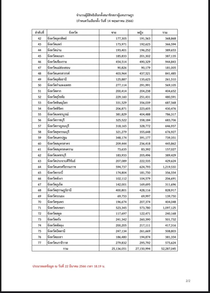 กรุงเทพฯ 22 มี.ค. – เปิดข้อมูลมีสิทธิเลือกตั้ง ส.ส. ทั่วประเทศ 14 พ.ค.66 รวม 52.2 ล้านคน กทม. มากสุด 4.4 ล้าน ระนอง น้อยสุด 1.3 แสนคน