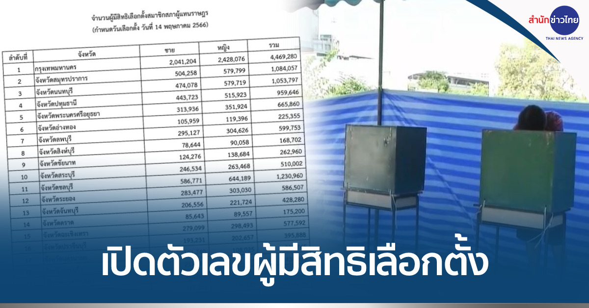 โดย 10 จังหวัดที่มีผู้มีสิทธิเลือกตั้งมากที่สุดตามลำดับ คือ กรุงเทพมหานคร 4,469,280 คน ตามมาด้วย นครราชสีมา 2,124,587 คน อุบลราชธานี 1,477,644 คน ขอนแก่น 1,453,689 คน เชียงใหม่ 1,333,088 คน บุรีรัมย์ 1,253,326 คน อุดรธานี 1,252,820 คน ชลบุรี 1,230,960 คน นครศรีธรรมราช 1,219,530 คน และศรีสะเกษ 1,166,887 คนส่วนจังหวัดที่มีผู้มีสิทธิเลือกตั้งน้อยที่สุด คือ ระนอง 139,750 คน .-สำนักข่าวไทย