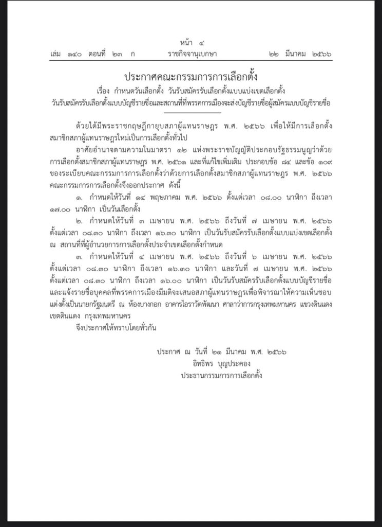 - กำหนดให้วันที่ 14 พฤษภาคม 2566 ตั้งแต่เวลา 08.00 -17.00 น. เป็นวันเลือกตั้ง