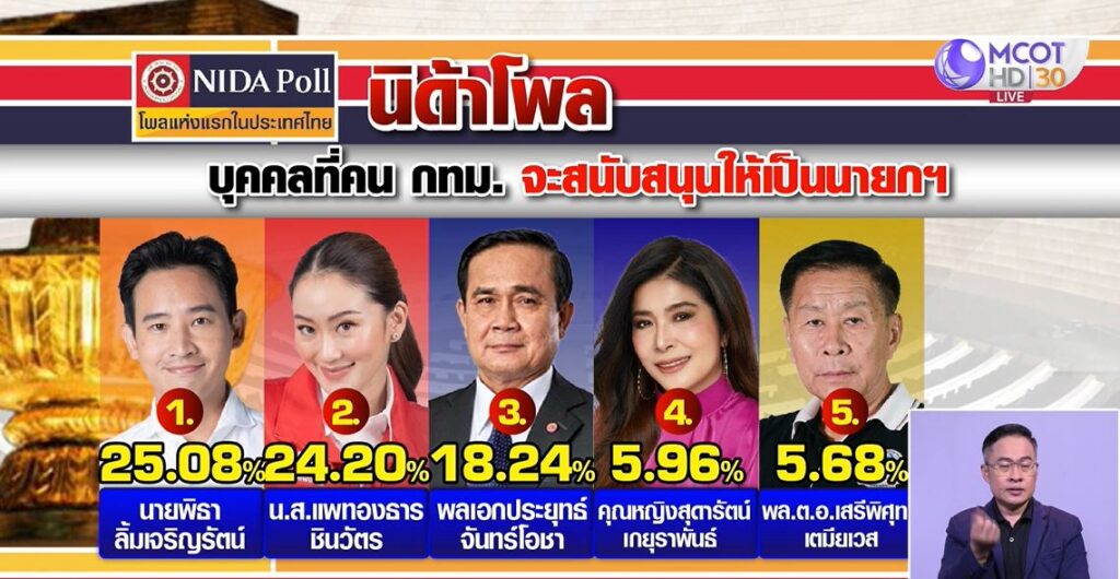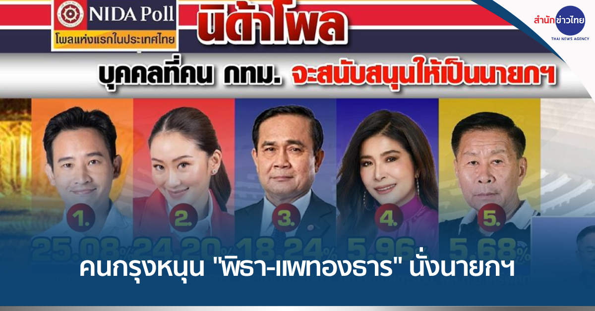 เมื่อถามถึงบุคคลที่คนกรุงเทพมหานครจะสนับสนุนให้เป็นนายกรัฐมนตรีในการเลือกตั้งครั้งนี้ พบว่า อันดับ 1 ร้อยละ 25.08 ระบุนายพิธา ลิ้มเจริญรัตน์ (พรรคก้าวไกล), อันดับ 2 ร้อยละ 24.20 ระบุว่า น.ส.แพทองธาร (อุ๊งอิ๊ง) ชินวัตร (พรรคเพื่อไทย)