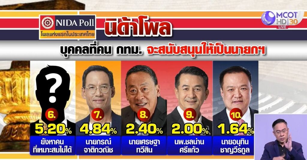 อันดับ 3 ร้อยละ 18.24 ระบุ พล.อ.ประยุทธ์ จันทร์โอชา (พรรครวมไทยสร้างชาติ), อันดับ 4 ร้อยละ 5.96 ระบุคุณหญิงสุดารัตน์ เกยุราพันธุ์ (พรรคไทยสร้างไทย), อันดับ 5 ร้อยละ 5.68 ระบุ พล.ต.อ.เสรีพิศุทธ์ เตมียเวส (พรรคเสรีรวมไทย)