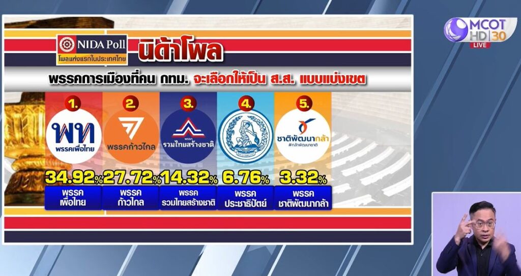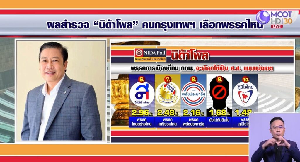 อันดับ 6 ร้อยละ 3.04 ระบุพรรคเสรีรวมไทย, อันดับ 7 ร้อยละ 2.60 ระบุพรรคไทยสร้างไทย, อันดับ 8 ร้อยละ 2.08 ระบุพรรคพลังประชารัฐ, อันดับ 9 ร้อยละ 1.44 ระบุพรรคภูมิใจไทย, อันดับ 10 ร้อยละ 1.28 ระบุยังไม่ตัดสินใจ .-สำนักข่าวไทย