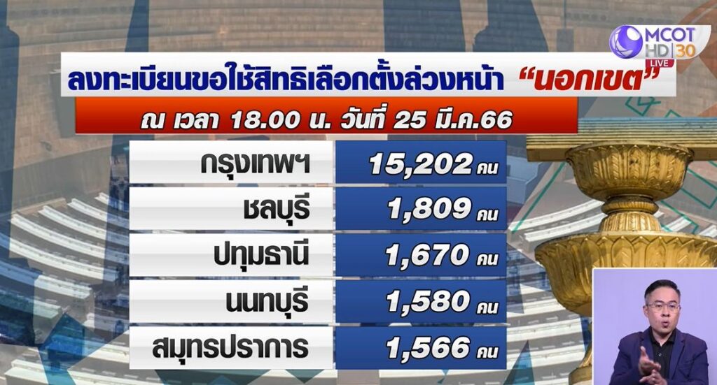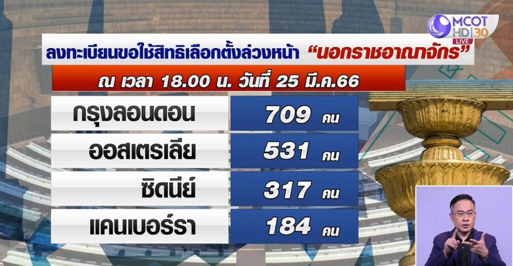 กรุงเทพฯ 26 มี.ค. – เปิดข้อมูลลงทะเบียนขอใช้สิทธิเลือกตั้งนอกเขต-นอกราชอาณาจักร วันแรก (25 มี.ค.) กว่า 30,000 คน กทม. ยื่นขอใช้สิทธิมากที่สุดกว่า 15,000 คน ส่วนเลือกตั้งนอกราชอาณาจักร พบอังกฤษมากสุด 709 คน ลงทะเบียนได้ถึง 9 เม.ย.นี้