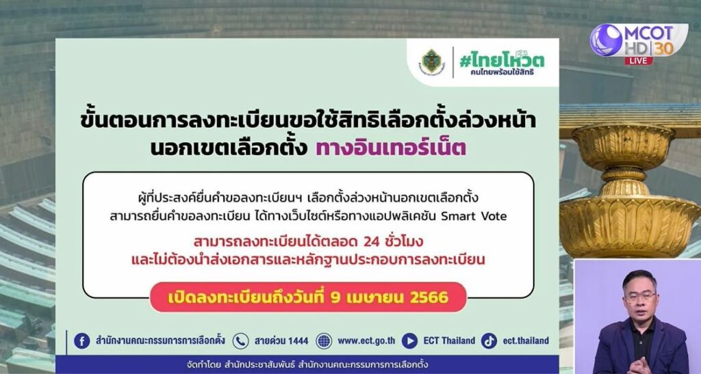 ผู้มีสิทธิเลือกตั้งที่พำนักอยู่ต่างประเทศ หรือต้องเดินทางไปต่างประเทศในช่วงเลือกตั้ง สามารถลงทะเบียนขอใช้สิทธิเลือกตั้งนอกราชอาณาจักร ทางอินเทอร์เน็ต เปิดลงทะเบียนถึงวันที่ 9 เมษายน 2566