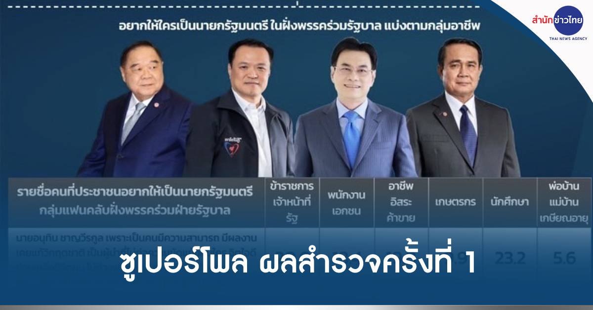 กทม. 26 มี.ค.-ซูเปอร์โพล เผยโพลเลือกตั้ง ส.ส. ครั้งที่ 1 “อนุทิน-จุรินทร์” ปาดหน้า “ลุงตู่” ครองใจเจ้าหน้าที่รัฐ -เกษตรกร คนอยากเปลี่ยนแปลง มีผลงาน ได้ภาพซื่อสัตย์ ไม่เป็นชนวนความขัดแย้ง ส่วน “อุ๊งอิ๊ง” ได้ใจแฟนคลับเพราะเป็นลูกทักษิณ ชินวัตร เป็นคนรุ่นใหม่ เข้าถึงชาวบ้านไม่ต้องการเห็นการสืบทอดอำนาจ