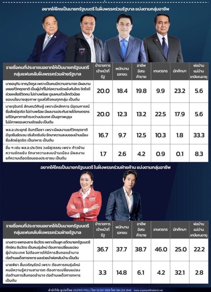 ที่น่าพิจารณาคือ ในกลุ่มแฟนคลับพรรคร่วมฝ่ายค้าน พบว่า นางสาวแพทองธาร ชินวัตร เป็นขวัญใจมากที่สุดในกลุ่มอาชีพเกษตรกร ร้อยละ 46.0 รองลงมาคือกลุ่มอาชีพอิสระและค้าขาย ร้อยละ 38.7 กลุ่มอาชีพพนักงานเอกชนร้อยละ 37.7 และกลุ่มอาชีพข้าราชการและเจ้าหน้าที่รัฐร้อยละ 36.7 ส่วนเหตุผลที่อยากให้เป็นนายกรัฐมนตรีในมุมมองของแฟนคลับพรรคร่วมฝ่ายค้านคือ เป็นลูก อดีตนายกรัฐมนตรี ทักษิณ ชินวัตร เป็นคนรุ่นใหม่ ต้องการเปลี่ยนแปลงผู้นำประเทศ ไม่ต้องการให้มีการสืบทอดอำนาจ ต่อต้านเผด็จการทหาร และช่วยนำพ่อกลับบ้าน เป็นต้น ในขณะที่ นายพิธา ลิ้มเจริญรัตน์ เป็นขวัญใจมากที่สุดในกลุ่มนักเรียนนักศึกษาร้อยละ 32.1 เพราะ ต้องการคนรุ่นใหม่ คนมีความรู้ความสามารถ ต้องการเปลี่ยนแปลง ต่อต้านการสืบทอดอำนาจ ต่อต้านเผด็จการทหาร เป็นต้น