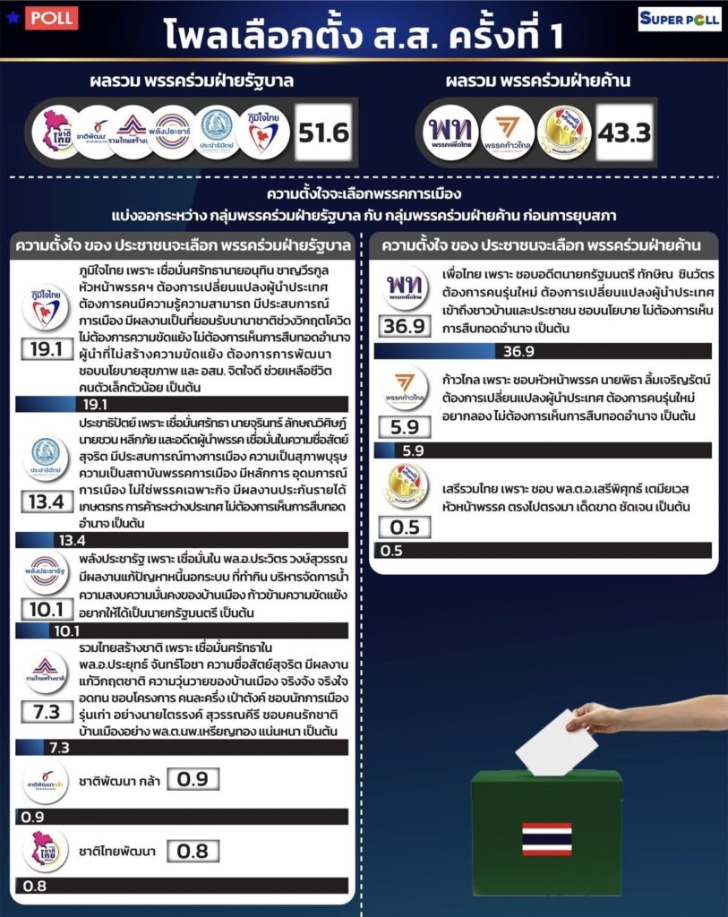 เมื่อวันที่ 26 มี.ค.สำนักวิจัยซูเปอร์โพล (SUPER POLL) เสนอผลสำรวจ เรื่อง โพลเลือกตั้ง ส.ส. ครั้งที่ 1 (ฉบับเต็ม) กรณีศึกษาตัวอย่างประชาชนผู้มีสิทธิเลือกตั้งทุกสาขาอาชีพทั่วประเทศอายุ 18 ปีขึ้นไป จำนวน 53,094,778 คน ดำเนินโครงการ จำนวน 1,257 ตัวอย่าง ระหว่างวันที่ 20 – 25 มีนาคม พ.ศ.2566 โดยมีประเด็นน่าสนใจคือ ความตั้งใจของประชาชนจะเลือกพรรคการเมือง แบ่งออกระหว่าง กลุ่มพรรคร่วมฝ่ายรัฐบาล และ กลุ่มพรรคร่วมฝ่ายค้าน พบว่า ในกลุ่มพรรคร่วมฝ่ายรัฐบาลรวมกันได้ร้อยละ 51.6 ในขณะที่ พรรคร่วมฝ่ายค้านตอนนี้รวมกันได้ร้อยละ 43.3 โดยในกลุ่มพรรคร่วมฝ่ายรัฐบาล อันดับหนึ่งได้แก่ พรรคภูมิใจไทย ได้ร้อยละ 19.1 เพราะ เชื่อมั่นศรัทธานายอนุทิน ชาญวีรกูล หัวหน้าพรรคฯ ต้องการเปลี่ยนแปลงผู้นำประเทศ ต้องการคนมีความรู้ความสามารถ มีประสบการณ์การเมือง มีผลงานเป็นที่ยอมรับนานาชาติช่วงวิกฤตโควิด ไม่ต้องการความขัดแย้ง ไม่ต้องการเห็นการสืบทอดอำนาจ ผู้นำที่ไม่สร้างความขัดแย้ง ต้องการการพัฒนา ชอบนโยบายสุขภาพ และ อสม. และนายอนุทิน ชาญวีรกูล หัวหน้าพรรคภูมิใจไทยเป็นคนจิตใจดี ช่วยเหลือชีวิตคนตัวเล็กตัวน้อย เป็นต้น