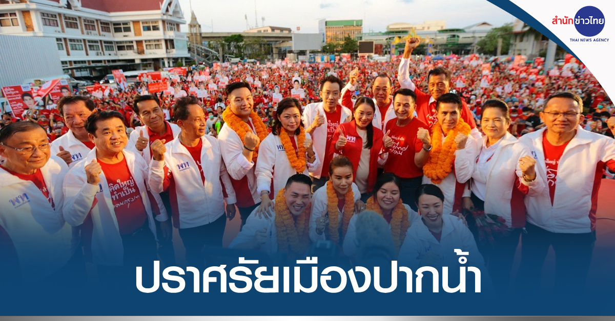 พรรคเพื่อไทย เปิดเวทีปราศรัย ‘ปักธง คิดใหญ่ ทำเป็น เพื่อไทยทุกคน เพื่อคนสมุทรปราการ’ ที่สนามหน้าศาลากลางจังหวัดสมุทรปราการ อำเภอเมือง จังหวัดสมุทรปราการ นำโดย นพ.ชลน่าน ศรีแก้ว หัวหน้าพรรคเพื่อไทย นายสุทิน คลังแสง รองหัวหน้าพรรคเพื่อไทย นายเสริมศักดิ์ พงษ์พานิช รองหัวหน้าพรรคเพื่อไทย น.ส.แพทองธาร ชินวัตร ประธานคณะที่ปรึกษาด้านการมีส่วนร่วมและนวัตกรรม พรรคเพื่อไทย และหัวหน้าครอบครัวเพื่อไทย นายจาตุรนต์ ฉายแสง กรรมการยุทธศาสตร์พรรคเพื่อไทย นายณัฐวุฒิ ใสยเกื้อ ผู้อำนวยการครอบครัวเพื่อไทย พร้อมด้วยแกนนำพรรค ได้แก่ นายพานทองแท้ ชินวัตร ที่ปรึกษาศูนย์อำนวยการเลือกตั้ง ส.ส.พรรคเพื่อไทย นายสมศักดิ์ เทพสุทิน และนายสุริยะ จึงรุ่งเรืองกิจ สมาชิกพรรคเพื่อไทย รวมทั้งว่าที่ผู้สมัครรับเลือกตั้ง ส.ส.สมุทรปราการ พรรคเพื่อไทย ได้แก่ น.ส.แพรวพรรณ พุกพิบูลย์ นายภิญโญ กิจเลิศไพโรจน์ นายประเสริฐ ชัยกิจเด่นนภาลัย นางสัมฤทธิ์ เหมะ นายนิธิพล บุญเพ็ชร น.ส.นฤมล ธารดำรงค์ นายประชา ประสพดี นางสลิลทิพย์ สุขวัฒน์ ท่ามกลางพี่น้องประชาชนเข้าร่วมเวทีการปราศรัยกว่าหมื่นคน