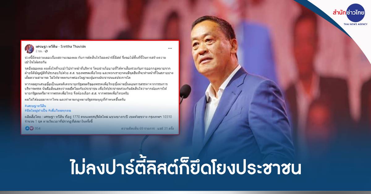 นายเศรษฐา ทวีสิน ที่ปรึกษาหัวหน้าครอบครัวเพื่อไทยโพสต์ข้อความ ผ่าน Facebook ระบุว่า “ช่วงนี้มีคนถามเยอะเรื่องสถานะของผม กับการตัดสินใจไม่ลงปาร์ตี้ลิสต์ จึงขอใช้พื้นที่นี้ในการสร้างความเข้าใจให้ตรงกัน