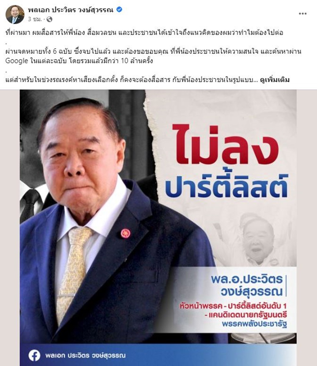 พล.อ.ประวิตร วงษ์สุวรรณ หัวหน้าพรรคพลังประชารัฐ โพสต์ข้อความผ่านเฟซบุ๊ก ชี้แจงกรณีลงปาร์ตี้ลิสต์ อันดับ 1 ว่า “ที่ผ่านมา ผมสื่อสารให้พี่น้อง สื่อมวลชน และประชาชนได้เข้าใจถึงแนวคิดของผมว่าทำไมต้องไปต่อ ผ่านจดหมายทั้ง 6 ฉบับ ซึ่งจบไปแล้ว และต้องขอขอบคุณที่พี่น้องประชาชนให้ความสนใจ และค้นหาผ่าน Google ในแต่ละฉบับ โดยรวมแล้วมีกว่า 10 ล้านครั้ง