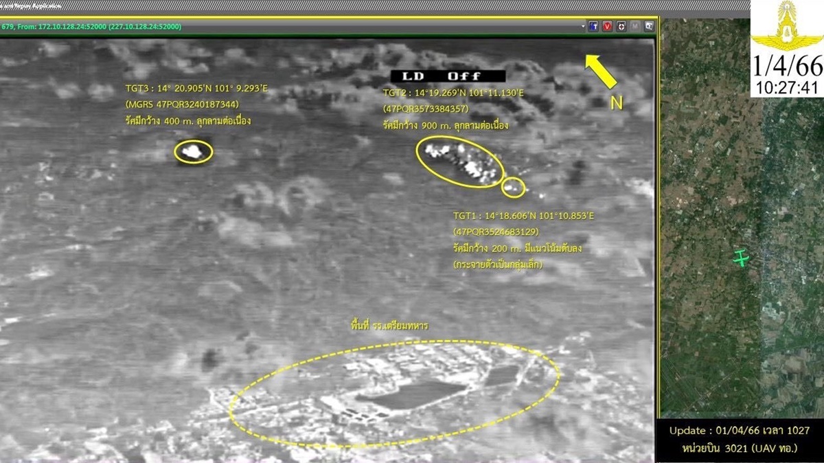 ในขณะที่อากาศยานไร้คนขับ (UAV) แบบ Aerostar BP จากฝูงบิน 302 กองบิน 3 ยังคงบินลาดตระเวนถ่ายภาพและถ่ายทอดสัญญาณในพื้นที่เป้าหมายตลอดภารกิจ เพื่อค้นหาจุดความร้อน และประเมินผลการปฏิบัติ ส่งให้ส่วนปฏิบัติการส่วนหน้าและหน่วยเกี่ยวข้องนำไปวางแผนการปฏิบัติต่อไป. – สำนักข่าวไทย