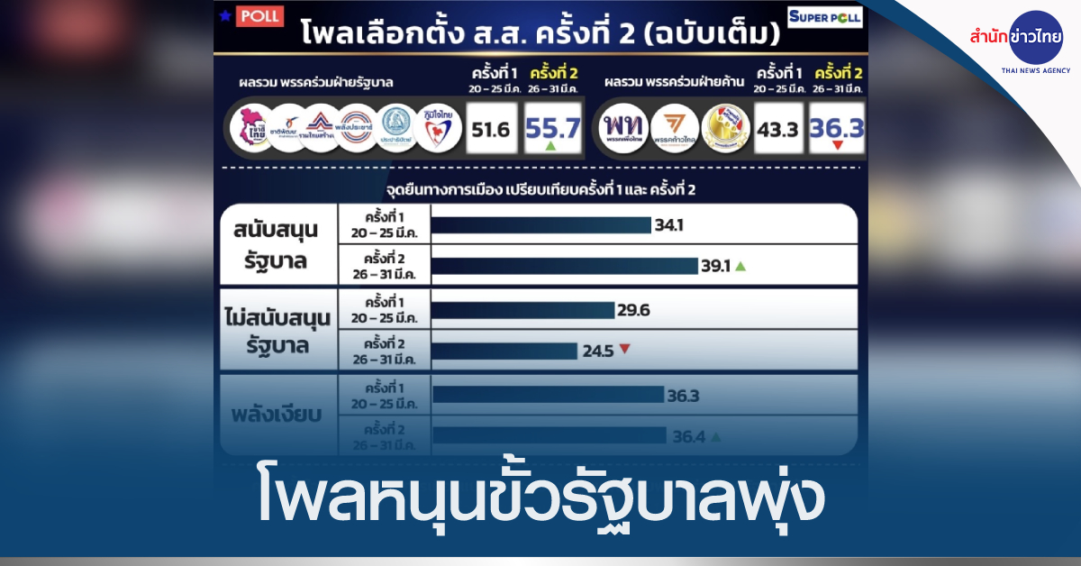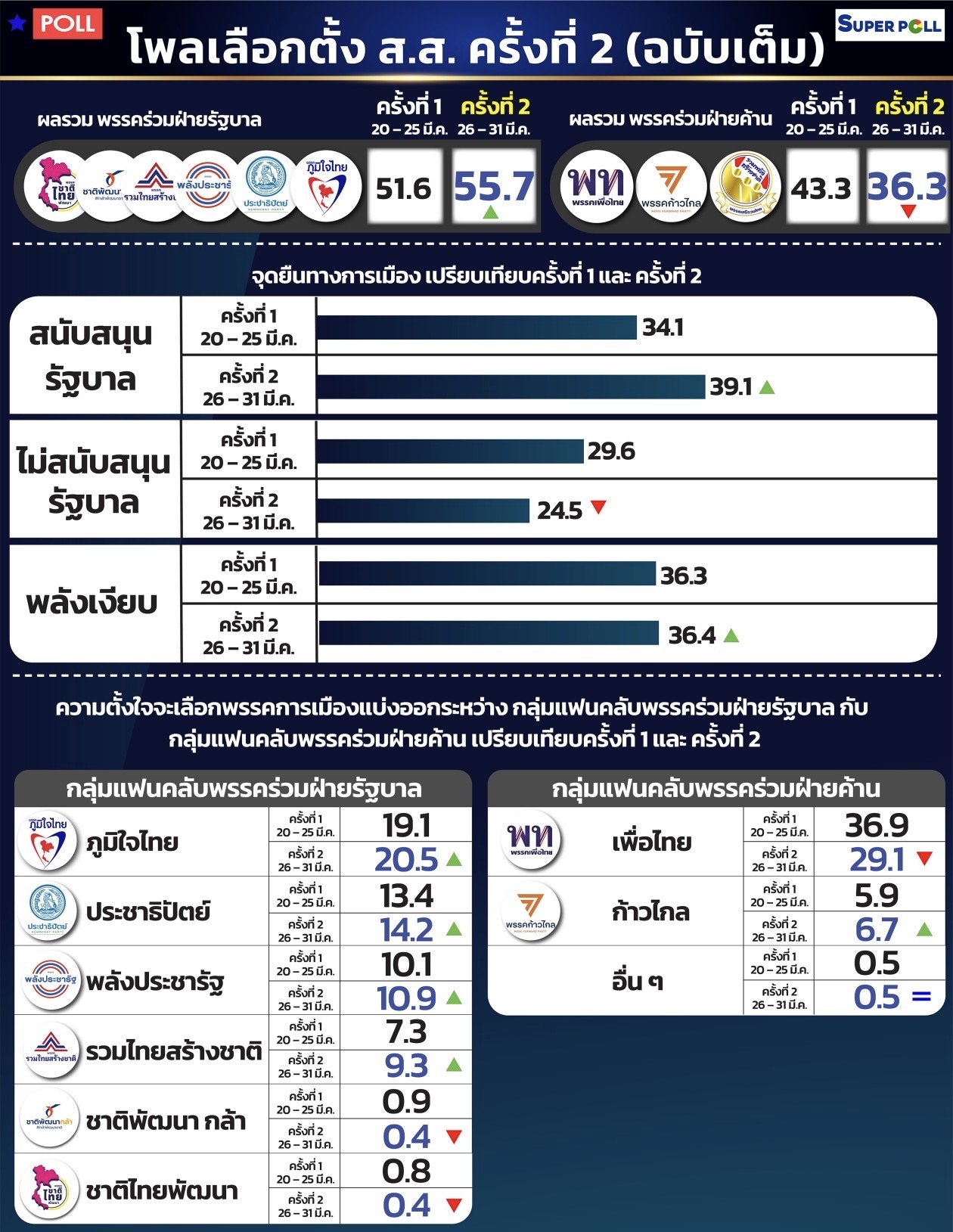 เมื่อวันที่ 1 เม.ย.66 สำนักวิจัยซูเปอร์โพล (SUPER POLL) เสนอผลสำรวจ เรื่อง “โพลเลือกตั้ง ส.ส. ครั้งที่ 2 (ฉบับเต็ม) กรณีศึกษาตัวอย่างประชาชนผู้มีสิทธิเลือกตั้งทุกสาขาอาชีพทั่วประเทศ อายุ 18 ปีขึ้นไป จำนวน 53,094,778 คน จำนวน 1,257 ตัวอย่าง ระหว่างวันที่ 26-31 มีนาคม 2566 โดยเมื่อเปรียบเทียบผลสำรวจจุดยืนทางการเมืองของประชาชน ระหว่างโพลเลือกตั้ง ส.ส. ครั้งที่ 1 และครั้งที่ 2 พบว่า กลุ่มผู้สนับสนุนรัฐบาลเพิ่มขึ้นจากร้อยละ 34.1 เป็นร้อยละ 39.1 ในขณะที่กลุ่มผู้ไม่สนับสนุนรัฐบาลลดลงจากร้อยละ 29.6 เป็นร้อยละ 24.5 และกลุ่มพลังเงียบยังคงเป็นตัวแปรสำคัญไม่เปลี่ยนแปลง คือ ร้อยละ 36.3 ในการสำรวจครั้งที่ 1 และร้อยละ 36.4 ในการสำรวจครั้งที่ 2