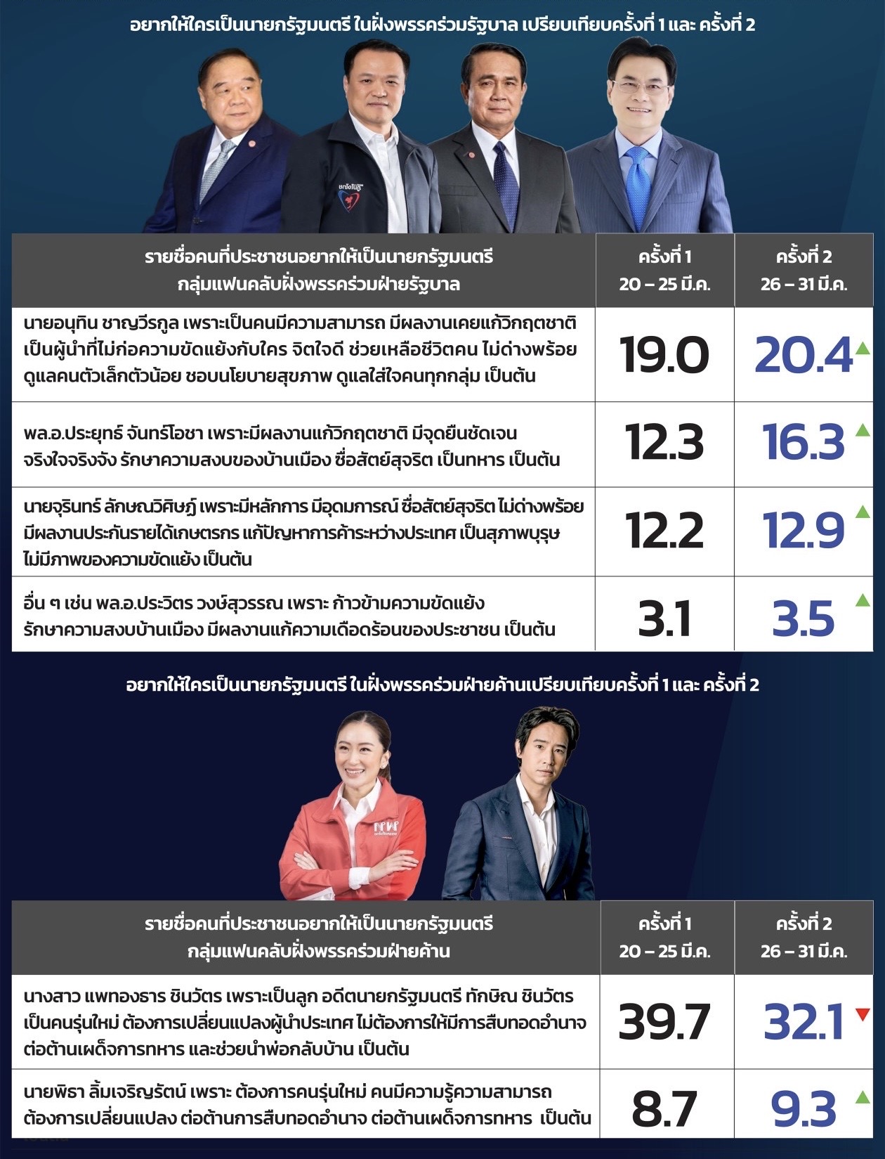 นอกจากนี้ ที่น่าสนใจคือ คนที่ประชาชนอยากได้เป็นนายกรัฐมนตรีคนต่อไปในกลุ่มแฟนคลับของพรรคร่วมรัฐบาล อันดับแรกยังคงเป็น นายอนุทิน ชาญวีรกูล เพิ่มขึ้นจากร้อยละ 19.0 ในการสำรวจครั้งที่ 1 มาอยู่ที่ร้อยละ 20.4 ในครั้งที่ 2 อย่างไรก็ตาม พล.อ.ประยุทธ์ จันทร์โอชา มีคะแนนเพิ่มขึ้นจากร้อยละ 12.3 ในครั้งที่ 1 มาอยู่ที่ร้อยละ 16.3 ในการสำรวจครั้งที่ 2 ในขณะที่นายจุรินทร์ ลักษณวิศิษฏ์ มีคะแนนเพิ่มขึ้นเช่นกัน จากร้อยละ 12.2 ในครั้งที่ 1 มาอยู่ที่ร้อยละ 12.9 ในครั้งที่ 2 และ พล.อ.ประวิตร วงษ์สุวรรณ มีสัดส่วนเพิ่มขึ้นเล็กน้อยจากร้อยละ 3.1 มาอยู่ที่ร้อยละ 3.5 ในการสำรวจครั้งล่าสุดนี้ อย่างไรก็ตาม ผลสำรวจส่วนของฝั่งพรรคร่วมฝ่ายค้าน พบว่า อันดับแรกยังคงเป็น น.ส.แพทองธาร ชินวัตร แต่สัดส่วนลดลงจากร้อยละ 39.7 ในการสำรวจครั้งแรก มาอยู่ที่ร้อยละ 32.1 ในครั้งที่ 2 ในขณะที่ นายพิธา ลิ้มเจริญรัตน์ กลับมีคะแนนเพิ่มขึ้นจากร้อยละ 8.7 ในครั้งที่ 1 มาอยู่ที่ร้อยละ 9.3 ในครั้งที่ 2 ตามลำดับ