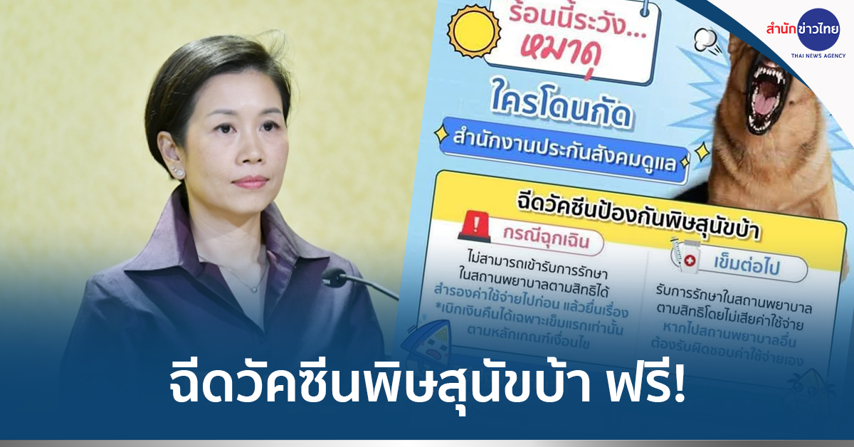 วันที่ 2 เมษายน 2566 นางสาวรัชดา ธนาดิเรก รองโฆษกประจำสำนักนายกรัฐมนตรี เปิดเผยว่า ในช่วงนี้นอกจากคนจะได้รับผลกระทบจากอากาศร้อนจัดแล้ว โรคหนึ่งที่มักเกิดขึ้นช่วงหน้าร้อนคือ โรคพิษสุนัขบ้า ซึ่งรัฐบาลโดยสำนักงานประกันสังคม ได้เปิดให้บริการฉีดวัคซีนป้องกันโรคพิษสุนัขบ้าโดยไม่เสียค่าใช้จ่ายสำหรับผู้ประกันตน ซึ่งการฉีดวัคซีนสามารถฉีดได้ทั้งก่อนโดนกัดและหลังโดนกัด แต่กรณีหลังต้องมาฉีดให้ไวที่สุดเพื่อป้องกันไวรัสเข้าสู่ระบบประสาท เงื่อนไขมีดังนี้