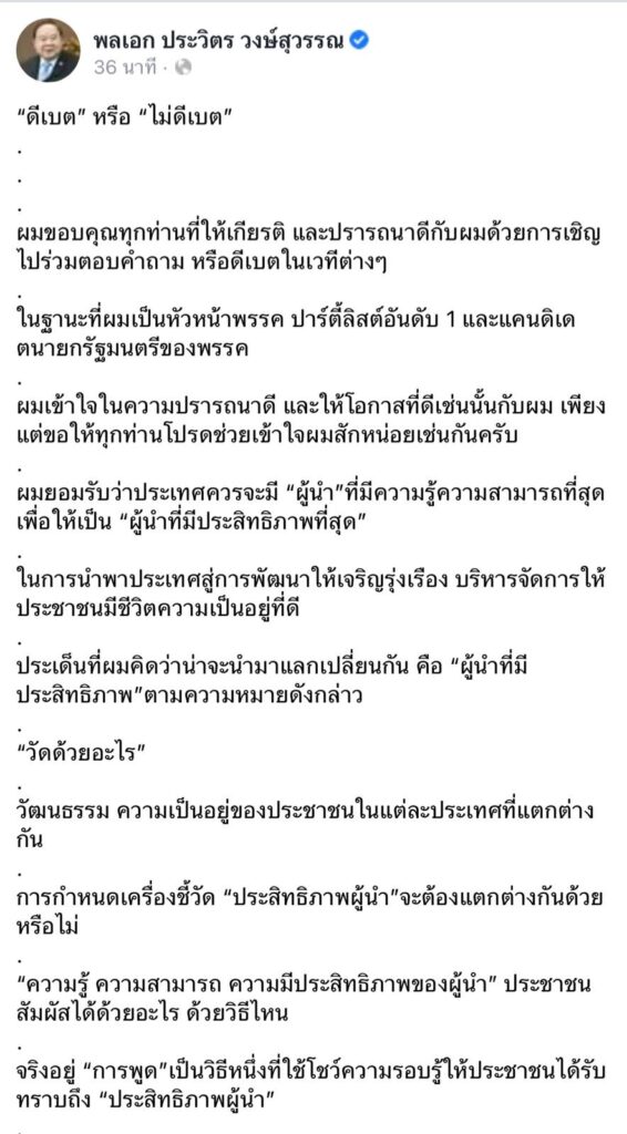 ผู้สื่อข่าวรายงานว่า เพจเฟซบุ๊ก “พลเอก ประวิตร วงษ์สุวรรณ” ของ พล.อ.ประวิตร วงษ์สุวรรณ รองนายกรัฐมนตรีและหัวหน้าพรรคพลังประชารัฐ โพสต์ข้อความระบุว่า “ดีเบต” หรือ “ไม่ดีเบต”