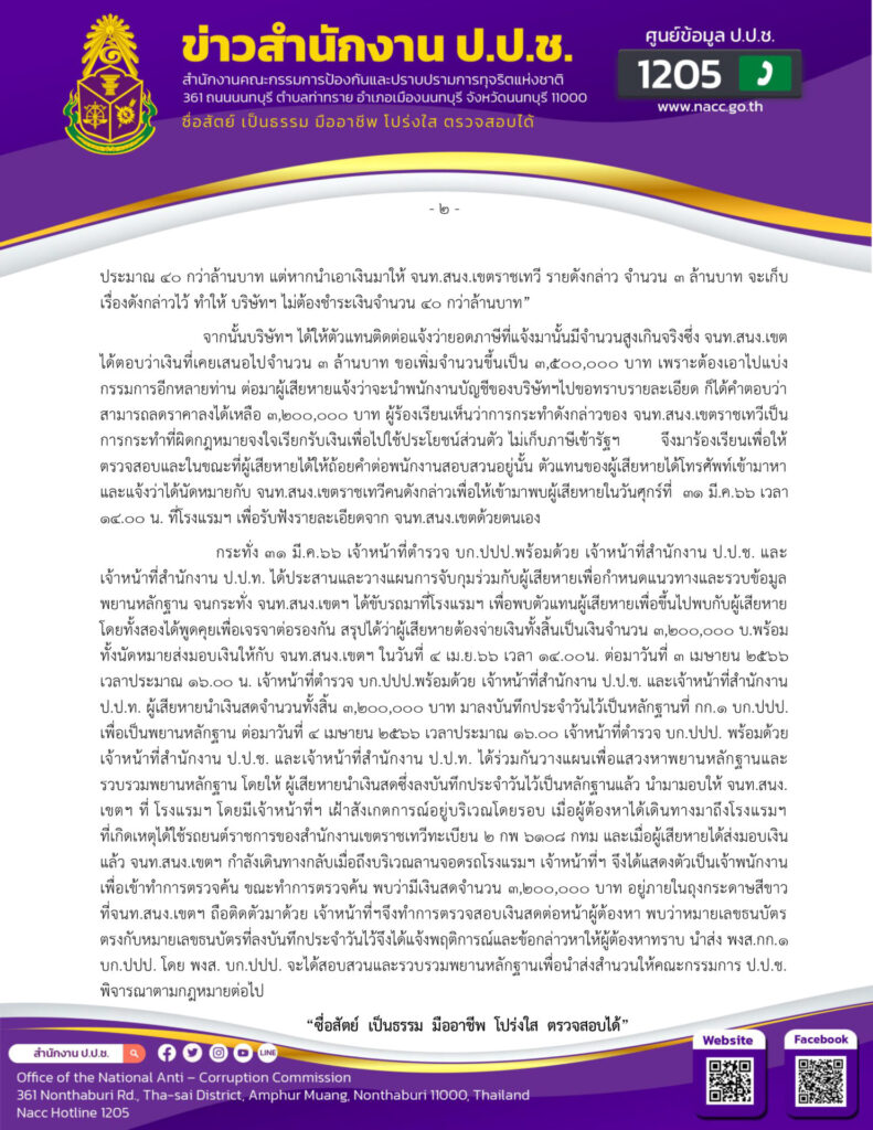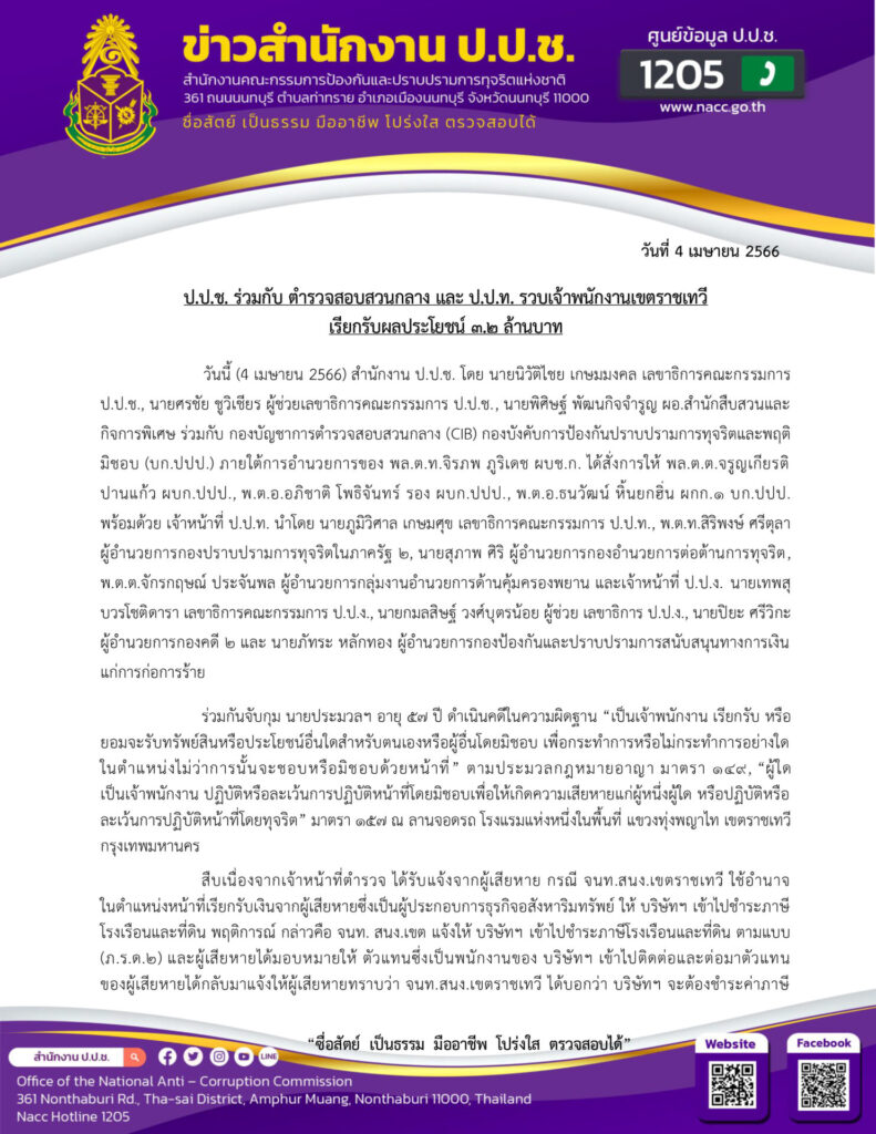 ป.ป.ช. 4 เม.ย.- “ป.ป.ช.- ตร.” บุกรวบเจ้าหน้าที่ สนง.เขตราชเทวี เรียกรับผลประโยชน์ 3.2 ล้านบาท เจ้าตัวปฏิเสธอ้างคิดว่าเป็นเอกสาร