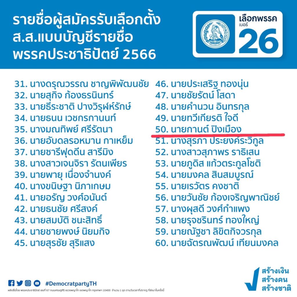 ดร.มัลลิกา บุญมีตระกูล มหาสุข เปิดเผยว่า พรรคประชาธิปัตย์ส่งนายกานต์ ปิงเมือง อดีตเลขาฯ สมาคมคนตาบอดจังหวัดพะเยา โดยเขาดำรงตำแหน่งเมื่อปี 2558-2562 และปัจจุบันเป็นนายกสมาคมก่อเกื้ออาชีพคนพิการ ลงสมัครบัญชีรายชื่อพรรค เพื่อเป็นตัวแทนกลุ่มเปราะบาง และเป็นปากเสียงผู้พิการด้วย