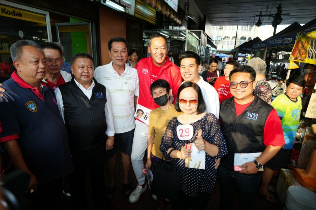 นายเศรษฐา ทวีสิน แคนดิเดตนายกรัฐมนตรีและประธานที่ปรึกษาหัวหน้าครอบครัวเพื่อไทย นางพวงเพ็ชร ชุนละเอียด ประธานคณะกรรมการประสานงานด้านการเมืองพื้นที่กรุงเทพมหานคร นายวราวุธ ยันต์เจริญ รองประธานคณะกรรมการประสานงานด้านการเมืองพื้นที่ กทม. พรรคเพื่อไทย นายจักรพงษ์ แสงมณี นายทะเบียนและคณะทำงานด้านเศรษฐกิจพรรคเพื่อไทย นายดนุพร ปุณณกันต์ ประธานคณะรณรงค์หาเสียงกรุงเทพมหานคร น.ส.ขัตติยา สวัสดิผล โฆษกกทม. นายประภัสร์ จงสงวน ผู้สมัคร ส.ส.แบบบัญชีรายชื่อ พร้อมด้วยนายศิลปวิชญ์ น้อยสมมิตร ผู้สมัคร ส.ส.เขตคลองสาน,เขตธนบุรี (ยกเว้นแขวงวัดกัลยาณ์ แขวงหิรัญรูจีและแขวงบางยี่เรือ) ,เขตราษฎร์บูรณะ (เฉพาะแขวงบางประกอก) พรรคเพื่อไทย และนายอารุม ตุ้มน้อย เขตบางกอกใหญ่,เขตภาษีเจริญ (ยกเว้นแขวงบางหว้า แขวงบางด้วนและแวงคลองขวาง), เขตธนบุรี (เฉพาะแขวงวัดกัลยาณ์ แขวงหิรัญรูจีและแขวงบางยี่เรือ), เขตตลิ่งชัน (เฉพาะแขวงบางเชือกหนัง), เขตบางกอกน้อย (เฉพาะแขวงศิริราช)