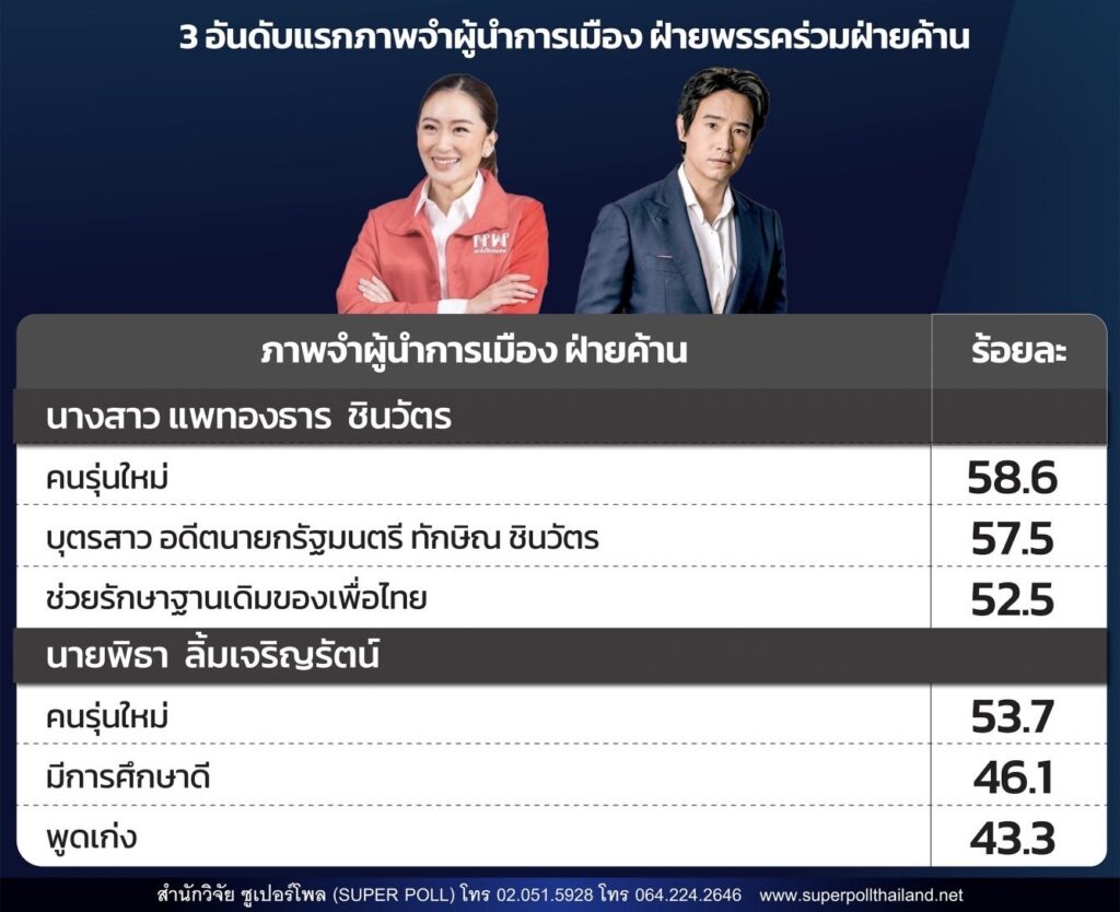 อย่างไรก็ตาม 3 อันดับแรกภาพจำผู้นำการเมือง พรรคร่วมฝ่ายค้าน พบว่าสำหรับนางสาวแพทองธาร ชินวัตร ได้แก่ คนรุ่นใหม่ ร้อยละ 58.6 บุตรสาวอดีตนายกรัฐมนตรีทักษิณ ชินวัตร ร้อยละ 57.5 และช่วยรักษาฐานเดิมของพรรคเพื่อไทย ร้อยละ 52.5 ในขณะที่นายพิธา ลิ้มเจริญรัตน์ เป็นคนรุ่นใหม่ ร้อยละ 53.7 มีการศึกษาดี ร้อยละ 46.1 พูดเก่ง ร้อยละ 43.3 ตามลำดับ. -สำนักข่าวไทย
