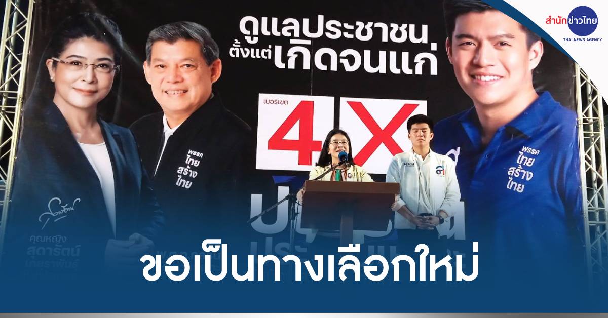 คุณหญิงสุดารัตน์ ย้ำว่าจะขอทำภารกิจสุดท้ายให้สำเร็จ โดยเฉพาะการนำพี่น้องประชาชนไปสู่ชัยชนะ การนำพี่น้องออกจากความขัดแย้งทางการเมือง 2 ขั้ว ที่ต่างแย่งชิงอำนาจมาตั้งแต่ปี 2549 ที่เลือกฝั่งหนึ่งก็ติดหล่ม เลือกอีกฝั่งก็ติดล็อค กลายเป็นสงครามการเมือง มากว่า 17 ปี มีการรัฐประหารถึง 2 ครั้ง และทุกครั้งที่มีการรัฐประหารประชาชนจะเป็นผู้พ่ายแพ้มาตลอด เกิดความทุกข์ยากเศรษฐกิจตกต่ำทุกหย่อมหญ้า และถ้าเลือกแบบเดิม ก็จะวนลูปความความขัดแย้ง ถ้าแก้ปัญหาการเมืองไม่ได้จะไม่สามารถแก้ไขปัญหาเศรษฐกิจได้ จึงขอให้เลือก “พรรคไทยสร้างไทยหมายเลข 32” ประเทศไทยจะไปรอด เราตั้งปณิธานที่จะทำให้พี่น้องหายทุกข์ หายจน และยืนยันว่า หากพรรคไทยสร้างไทย ได้เป็นรัฐบาล จะทำให้พี่น้อง หายจนหมดหนี้ มีรายได้อย่างยั่งยืน ภายในสามปี และพรรคไทยสร้างไทย จะไม่เข้ามาสร้างวิกฤติแบบ 17 ปีที่ผ่านมา ไม่สร้างความขัดแย้งจนนำไปสู่การรัฐประหารอีก