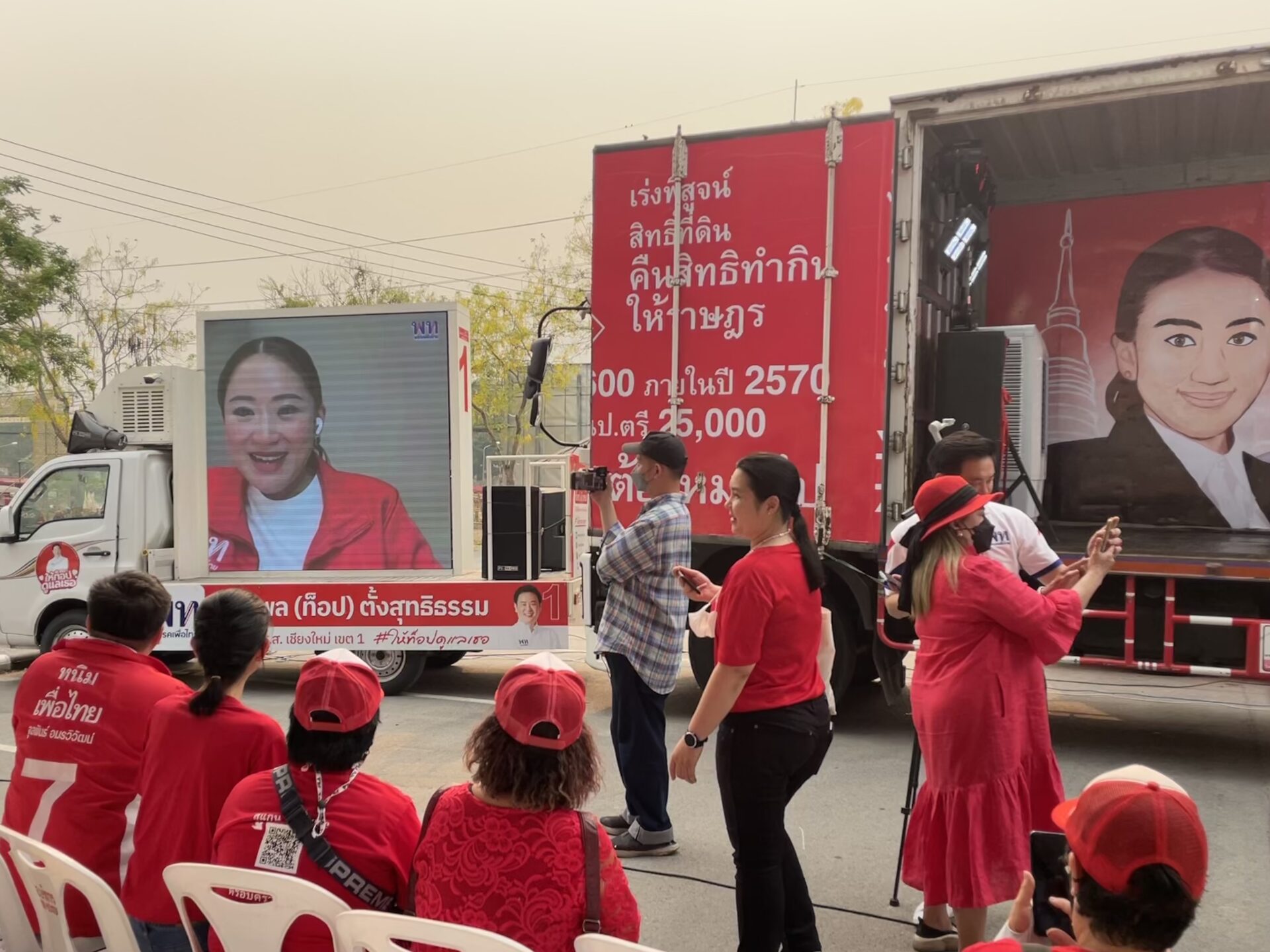 น.ส.แพทองธาร ชินวัตร แคนดิเดตนายกรัฐมนตรี หัวหน้าครอบครัวเพื่อไทย โฟนอินเข้ามาเวทีปราศรัย โดยระบุว่า การหาเสียงครั้งนี้ ตนมาพบชาวเชียงใหม่ไม่ได้ โดยวันนี้ขอโฟนอินมาจากโรงพยาบาล แม้จะยังไม่ได้คลอด แต่อายุครรภ์ 8 เดือนครึ่งแล้ว จึงพาลูกมาพบคุณหมอ ไม่กี่วันนี้จะเป็นวันสงกรานต์แล้ว ขออวยพรให้ชาวเชียงใหม่และชาวภาคเหนือทุกคนมีความสุข ปลอดภัย และขอแสดงความห่วงใยปัญหา PM 2.5 ที่ยังวิกฤติอยู่ในภาคเหนือ ทำให้ตนเป็นห่วงว่า ในช่วงวันสงกรานต์นั้น นักท่องเที่ยวและชาวเชียงใหม่กลับมาร่วมงานสงกรานต์หนาแน่น และอาจเกิดความไม่สะดวกและมีปัญหาสุขภาพ จึงขอให้ระวังสุขภาพด้วย ดังนั้น ในวันข้างหน้า หากพรรคได้เป็นรัฐบาลจะเร่งออกกฎหมายอากาศสะอาด เพื่อแก้ปัญหา PM 2.5 ให้ยุติโดยเร็ว และการจะทำให้เกิดขึ้นได้จริงนั้น ขอชาวเชียงใหม่ลงคะแนนให้พรรคเพื่อไทยทั้ง 10 เขต แบบยกจังหวัด และ ส.ส.บัญชีรายชื่อด้วย