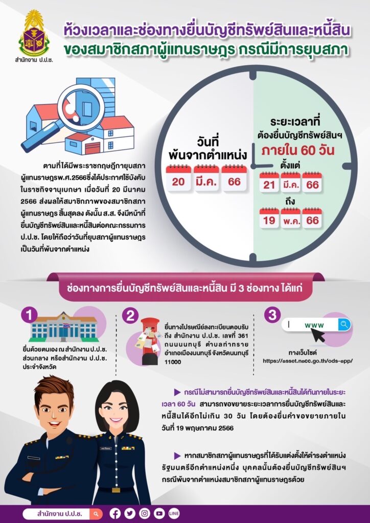 นายนิวัติไชย เกษมมงคล เลขาธิการคณะกรรมการ ป.ป.ช. ในฐานะโฆษกสำนักงาน ป.ป.ช. เปิดเผยว่า หลังจากที่ราชกิจจานุเบกษาได้เผยแพร่พระราชกฤษฎีกายุบสภาผู้แทนราษฎร พ.ศ. 2566 เมื่อวันที่ 20 มีนาคม 2566 ส่งผลให้สมาชิกภาพของสมาชิกสภาผู้แทนราษฎรสิ้นสุดลงตามรัฐธรรมนูญ ดังนั้นสมาชิกสภาผู้แทนราษฎรที่พ้นจากตำแหน่งจึงมีหน้าที่ต้องยื่นบัญชีทรัพย์สินและหนี้สินต่อคณะกรรมการ ป.ป.ช. ตาม พ.ร.ป.ว่าด้วยการป้องกันและปราบปรามการทุจริต พ.ศ. 2561 มาตรา 102 (1) ซึ่งกำหนดให้ยื่นบัญชีทรัพย์สินและหนี้สิน เมื่อเข้ารับตำแหน่งและเมื่อพ้นจากตำแหน่ง สำหรับการยื่นบัญชีทรัพย์สินครั้งนี้ให้ถือวันที่ยุบสภาคือวันที่ 20 มีนาคม 2566 เป็นวันที่พ้นจากตำแหน่ง และต้องยื่นบัญชีทรัพย์สินภายใน 60 ตั้งแต่วันที่ 21 มีนาคม ถึงวันที่ 19 พฤษภาคม 2566