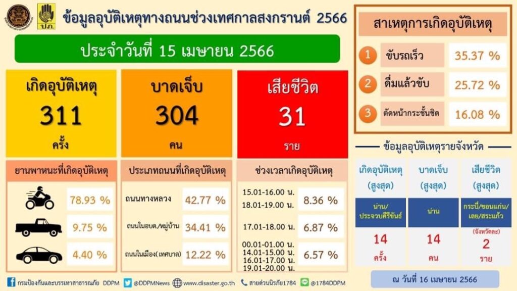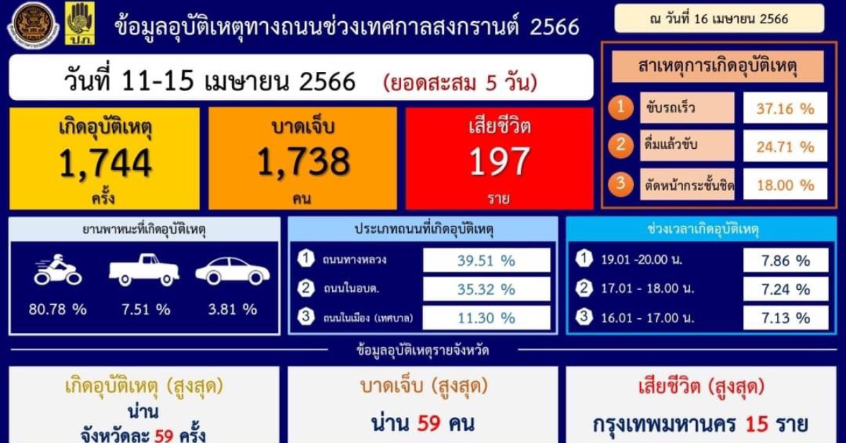 สรุปสถิติอุบัติเหตุทางถนนสะสม 5 วัน (วันที่ 11 – 15 เมษายน 2566) เกิดอุบัติเหตุรวม 1,744 ครั้ง ผู้เสียชีวิต 197 ราย ผู้บาดเจ็บ 1,738 คน โดยจังหวัดที่เกิดอุบัติเหตุสะสมสูงสุด ได้แก่ น่าน (59 ครั้ง) จังหวัดที่มีผู้เสียชีวิตสะสมสูงสุด ได้แก่ กรุงเทพมหานคร (15 ราย) และจังหวัดที่มีผู้บาดเจ็บสะสมสูงสุด ได้แก่ น่าน (59 คน) จังหวัดที่ไม่มีผู้เสียชีวิต 7 จังหวัด