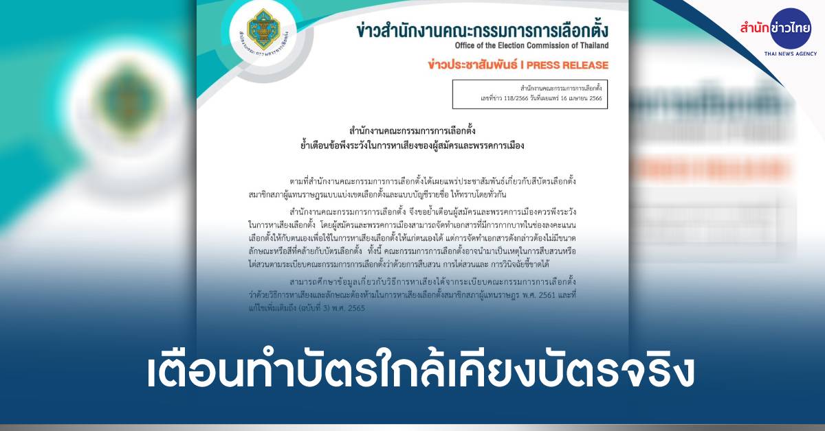 กทม. 16 เม.ย.-กกต.เตือนพรรค-ผู้สมัคร ทำบัตรเลือกตั้งใกล้เคียงบัตรจริง อาจเป็นเหตุนำไปสู่การวินิจฉัย พร้อมเผยภาพและสีบัตรเลือกตั้งแล้ว