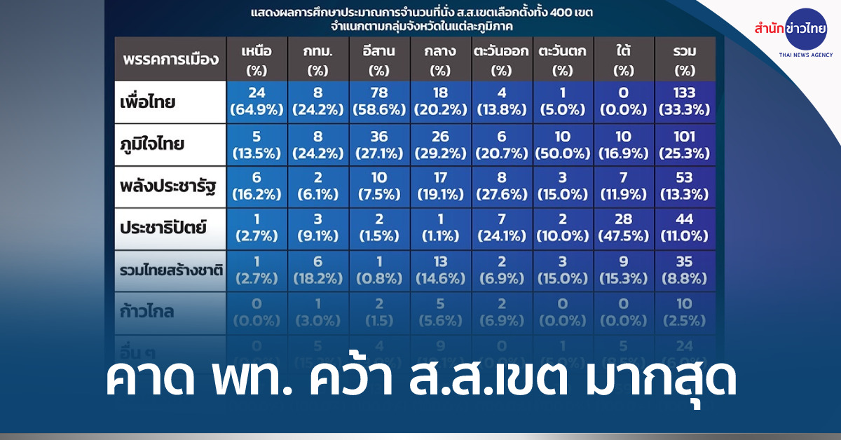 กรุงเทพฯ 16 เม.ย. – ซูเปอร์โพล เผยคนส่วนใหญ่ร้อยละ 70.5 บอกไปเลือกตั้ง ส.ส. ขณะที่ร้อยละ 29.5 จะไม่ไปเลือกตั้ง คาด “เพื่อไทย” คว้า ส.ส. เขตแลนสไลด์ในภาคอีสาน 78 คน และภาคเหนือ 24 คน “ภท.” คาดได้ ส.ส.เขตมาอันดับสอง 101 คน มากสุดภาคตะวันตก 10 ที่นั่ง แถมเจาะไข่แดง กทม. สำเร็จ 8 ที่นั่ง ปชป. ได้ภาคใต้ 28 ที่นั่ง ส่วน พปชร. คาดได้ 53 คน ด้านรทสช. คาดได้ ส.ส.เขต 35 คน กทม.ได้ 1 คน-ภาคใต้ 9 คน