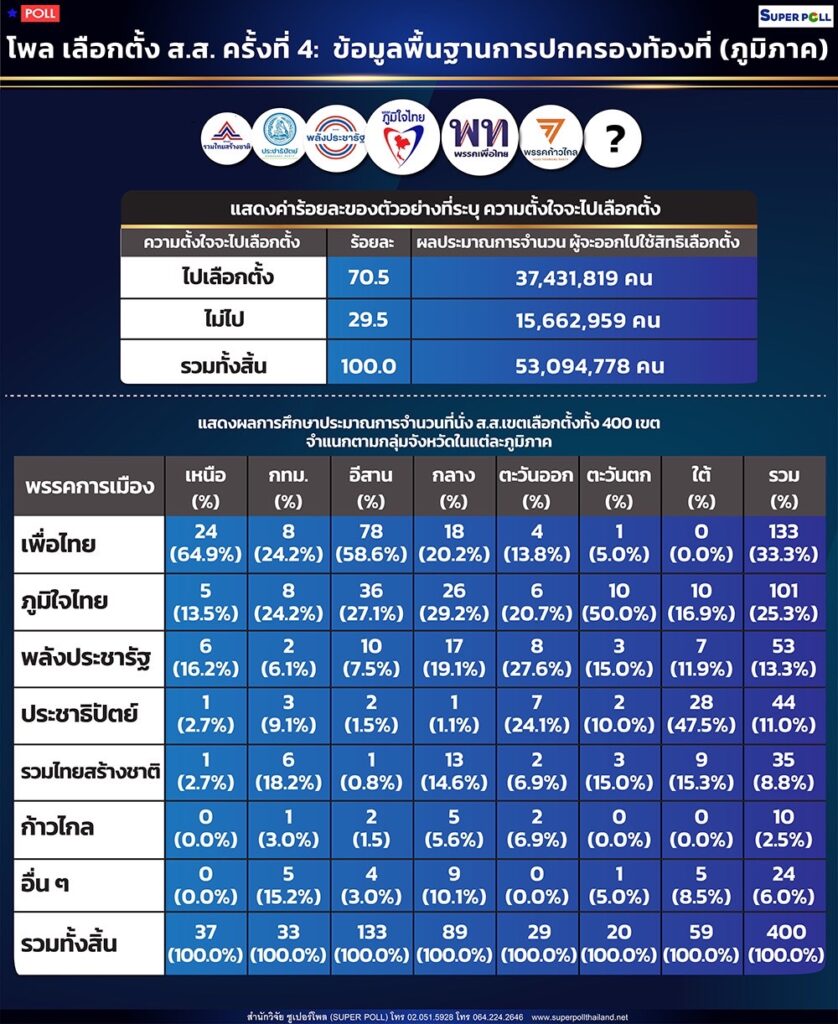 เมื่อวันที่ 16 เม.ย.สำนักวิจัยซูเปอร์โพล (SUPER POLL) เสนอผลการศึกษาต่อเนื่อง เรื่อง “โพล เลือกตั้ง ส.ส. ครั้งที่ 4 : ข้อมูลพื้นฐานการปกครองท้องที่ (ภูมิภาค)” กรณีศึกษาประชาชนผู้มีสิทธิเลือกตั้งผู้แทนราษฎร (ส.ส.) ทุกสาขาอาชีพทั่วประเทศอายุ 18 ปีขึ้นไปใน 400 เขตเลือกตั้งและผลการประมาณการจำนวน 100 ที่นั่งผู้แทนราษฎรหรือ ส.ส. ในบัญชีรายชื่อของแต่ละพรรคการเมืองผู้มีสิทธิเลือกตั้ง 53,094,778 คนทั่วประเทศรวบรวมข้อมูลจากฐานข้อมูลทะเบียนราษฎร์ กรมการปกครอง ดำเนินโครงการศึกษาจำนวนตัวอย่าง 6,990 ตัวอย่าง ระหว่างวันที่ 5 – 15 เมษายน พ.ศ.2566 โดยเมื่อพิจารณาความตั้งใจจะไปเลือกตั้งของประชาชนพบว่า ส่วนใหญ่หรือร้อยละ 70.5 หรือประมาณการจำนวนผู้มีสิทธิเลือกตั้งรวมทั้งสิ้น 37,431,819 คน จะไปเลือกตั้ง ในขณะที่ร้อยละ 29.5 หรือ ประมาณการจำนวนผู้มีสิทธิเลือกตั้งรวมทั้งสิ้น 15,662,959 คน จะไม่ไปเลือกตั้ง