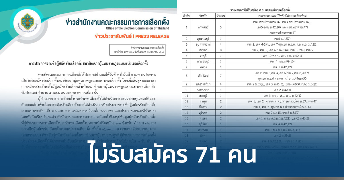 สำนักงานคณะกรรมการการเลือกตั้ง สรุปข้อมูลผู้สมัครรับเลือกตั้งที่ผู้อำนวยการการเลือกตั้งประจำเขตเลือกตั้งประกาศไม่รับสมัคร 31 จังหวัด จำนวน 71 คน คงเหลือผู้สมัครรับเลือกตั้งแบบแบ่งเขตเลือกตั้ง ทั้งสิ้น 4,710 คน สำหรับผู้สมัครรับเลือกตั้ง ส.ส.ที่ผู้อำนวยการการเลือกตั้งประจำเขตเลือกตั้งประกาศไม่รับสมัคร สามารถยื่นคำร้องต่อศาลฎีกาได้ภายใน 7 วัน นับแต่วันที่ประกาศรายชื่อ โดยไม่ต้องเสียค่าธรรมเนียมศาลในการดำเนินกระบวนพิจารณา