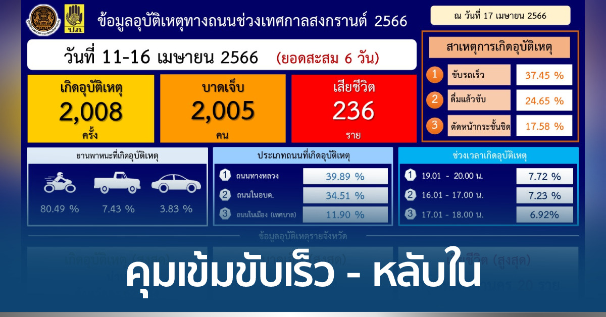 สรุปสถิติอุบัติเหตุทางถนนสะสม 6 วัน (วันที่ 11 – 16 เมษายน 2566) เกิดอุบัติเหตุรวม 2,008 ครั้ง ผู้เสียชีวิต 236 ราย ผู้บาดเจ็บ 2,005 คน โดยจังหวัดที่เกิดอุบัติเหตุสะสมสูงสุด ได้แก่ น่าน (62 ครั้ง) จังหวัดที่มีผู้เสียชีวิตสะสมสูงสุด ได้แก่ กรุงเทพมหานคร (20 ราย) และจังหวัดที่มีผู้บาดเจ็บสะสมสูงสุด ได้แก่ น่าน (63 คน) จังหวัดที่ไม่มีผู้เสียชีวิต 2 จังหวัด